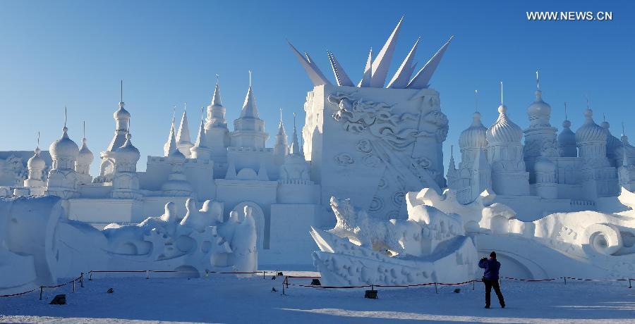 A tourist takes pictures of a snow sculpture at the 27th International Snow Sculpture Art Expo in Harbin, capital of northeast China's Heilongjiang province, Jan 6, 2015. (Xinhua/Wang Jianwei)