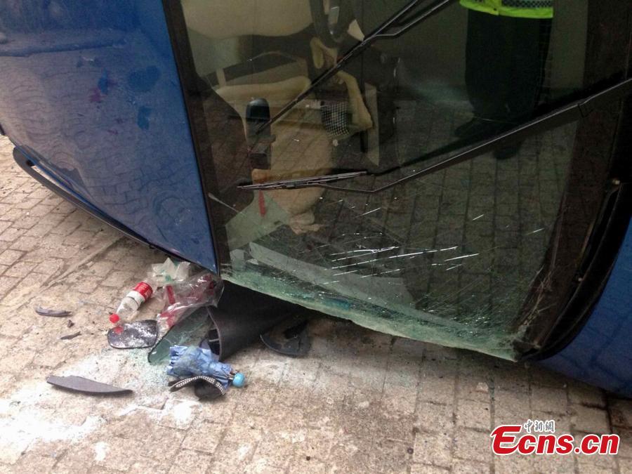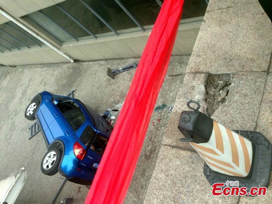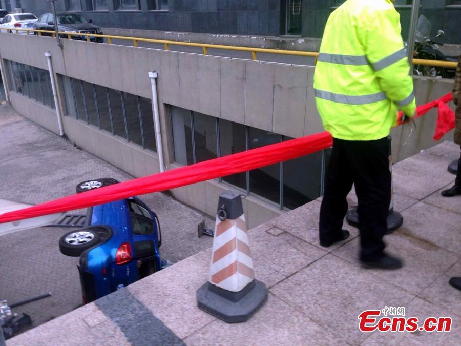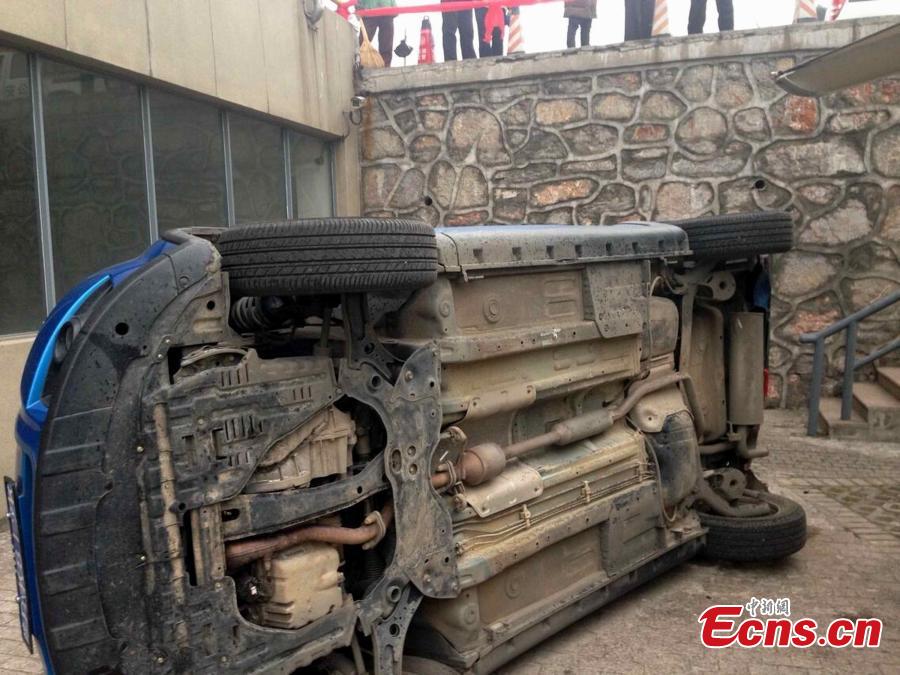 A car overturns after falling from a 6-meter-high platform in Wuhu, East China’s Anhui province, Jan 6, 2015. A female driver failed to brake in time while driving it backwards. The driver was not hurt in the accident but the car was badly damaged, sources said. [Photo/ China News Service]