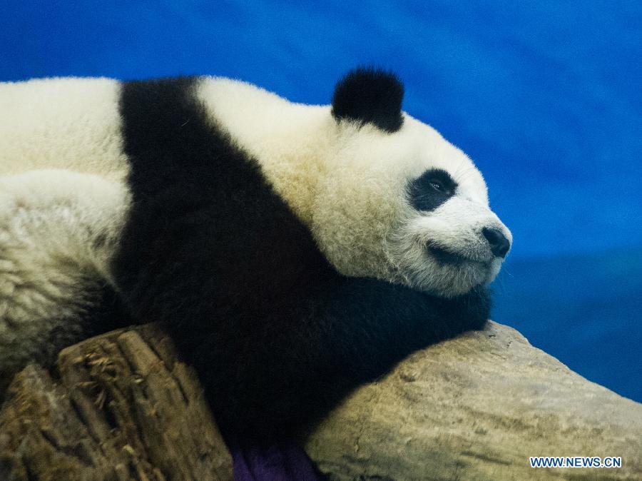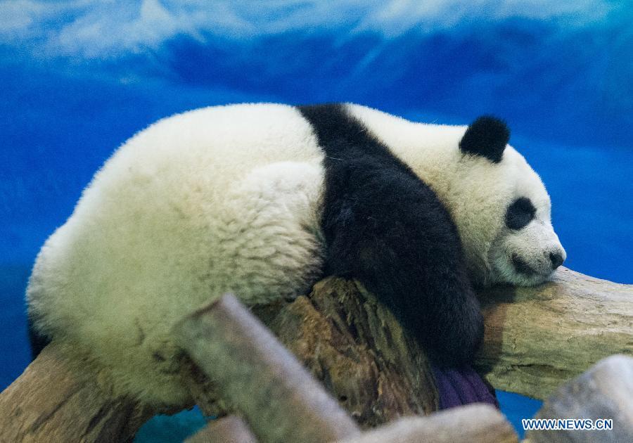 Giant panda cub "Yuanzai" rests at the Taipei Zoo in Taipei, southeast China's Taiwan, Jan 7, 2014. The cub, born on July 6, 2013, is the first baby of a pair of giant pandas, namely "Tuan Tuan" and "Yuan Yuan", who were given as a goodwill gift to Taiwan by the Chinese mainland. "Yuanzai" is weaned here on Tuesday. (Xinhua/Shen Hong)