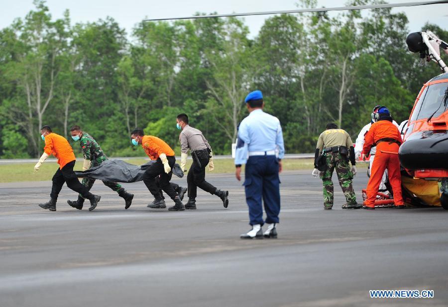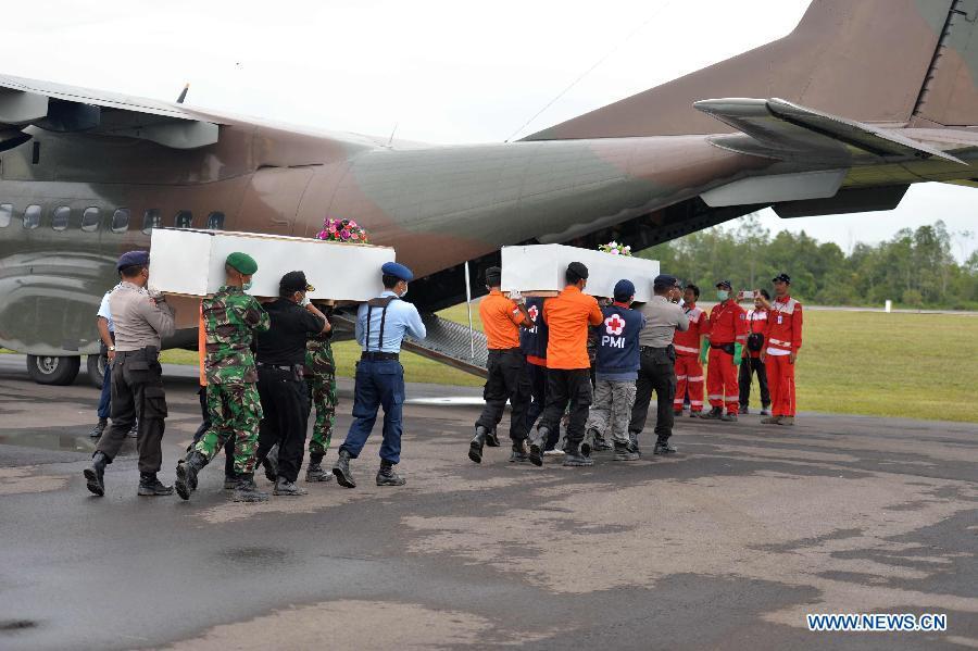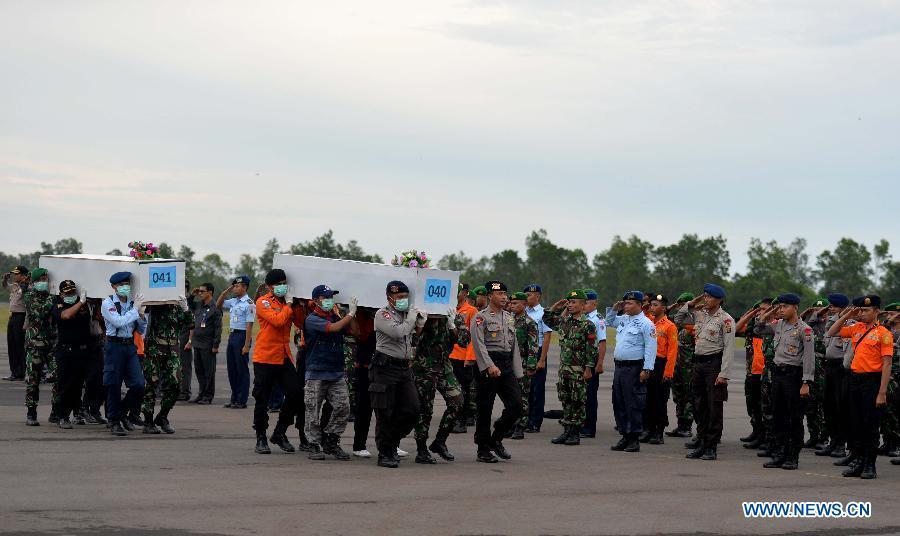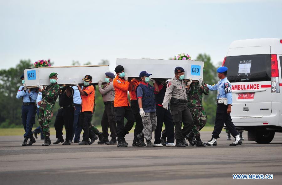 Rescuers carry coffins containing the bodies of victims of AirAsia flight QZ8501 in Pangkalan Bun, Indonesia, on Jan 8, 2015. So far, 44 bodies have been discovered by a multinational search team. (Xinhua/He Changshan)