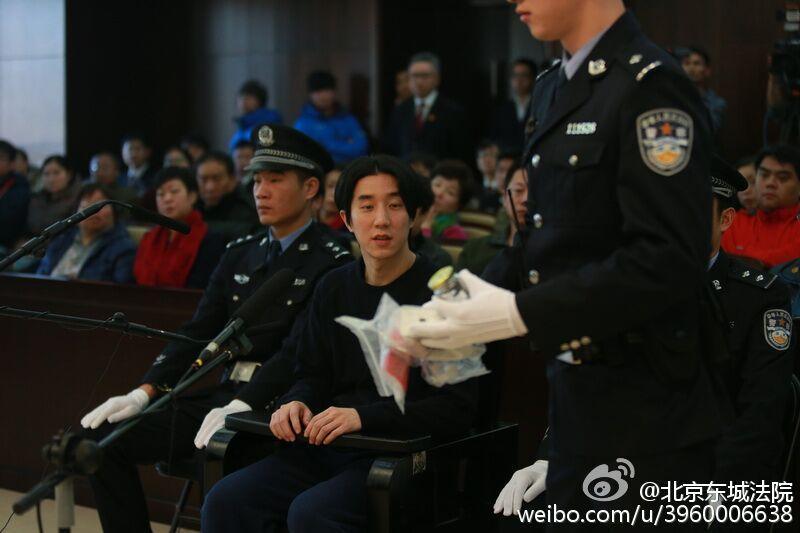 Jaycee Chan, son of Chinese kung fu star Jackie Chan, is being tried at Dongcheng District People's Court in Beijing on Jan 9, 2015. Jaycee Chan was sentenced to six months in jail on Friday for drug offense, according to the court. [Photo/Sina Weibo]