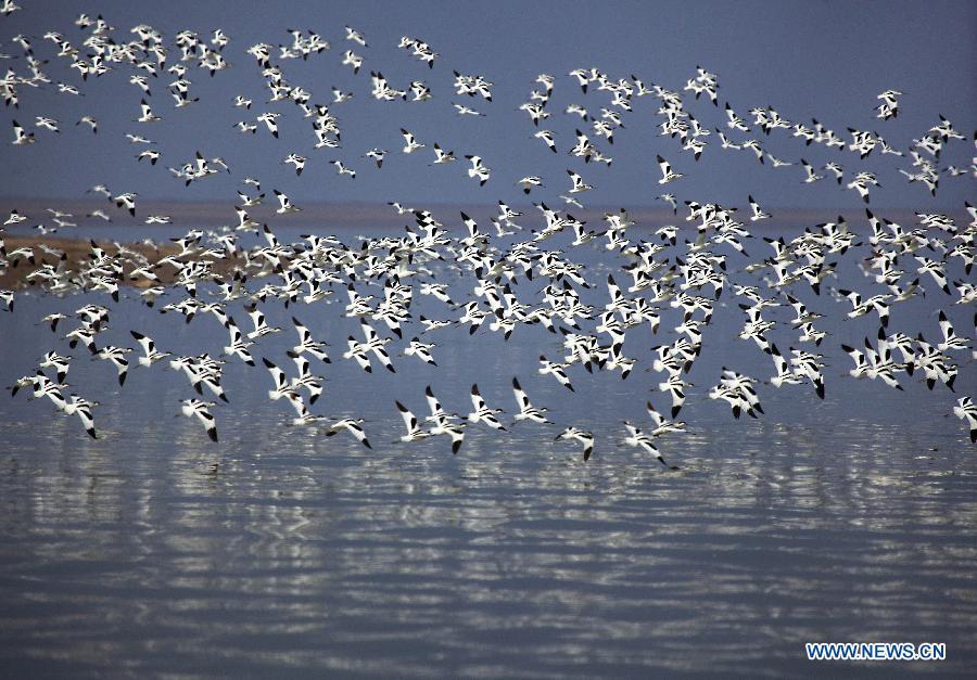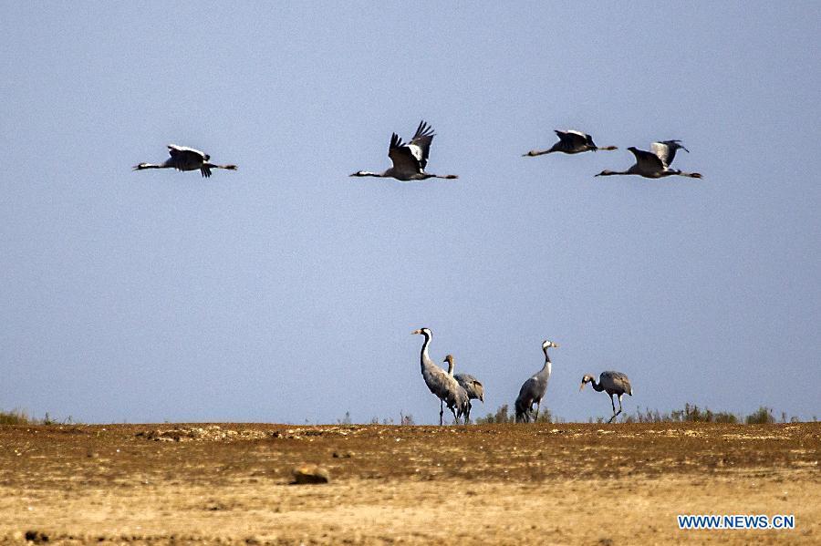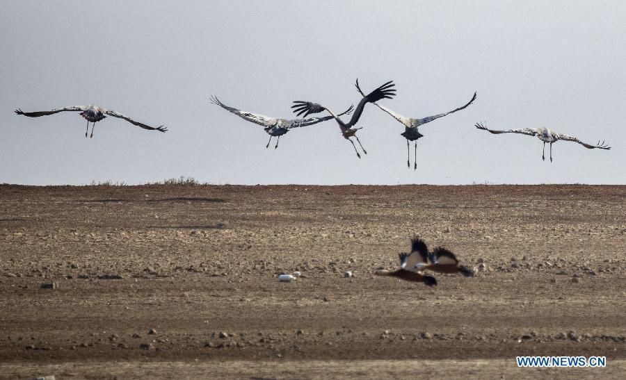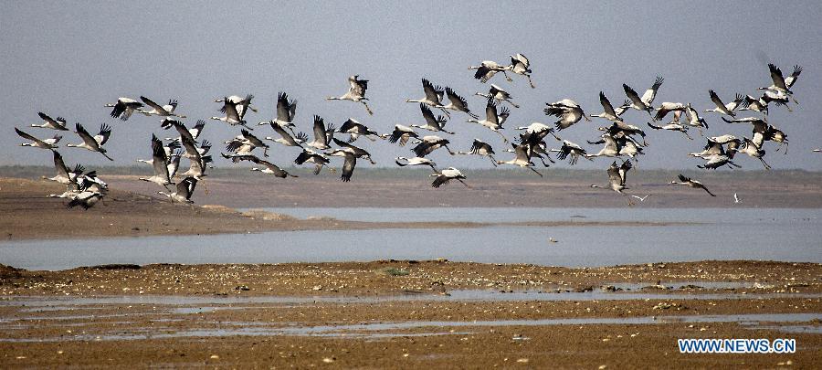 Grey cranes fly over the Poyang Lake in Jiujiang City, east China's Jiangxi province, Jan 8, 2015. The Poyang Lake, China's largest freshwater lake, witnessed the arrival of an increasing number of migratory birds in the winter time. (Xinhua/Fu Jianbin)