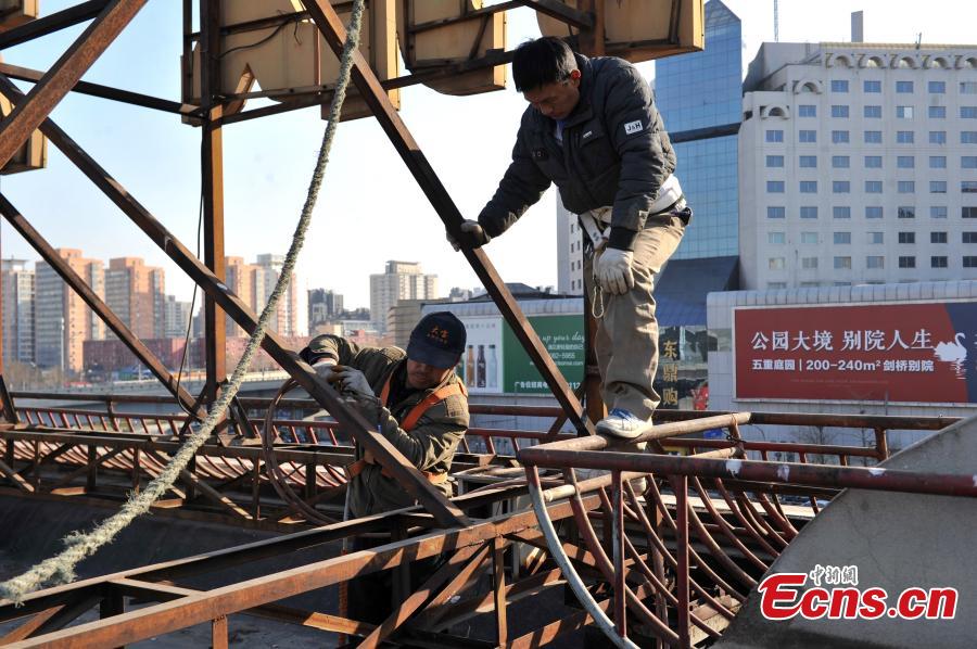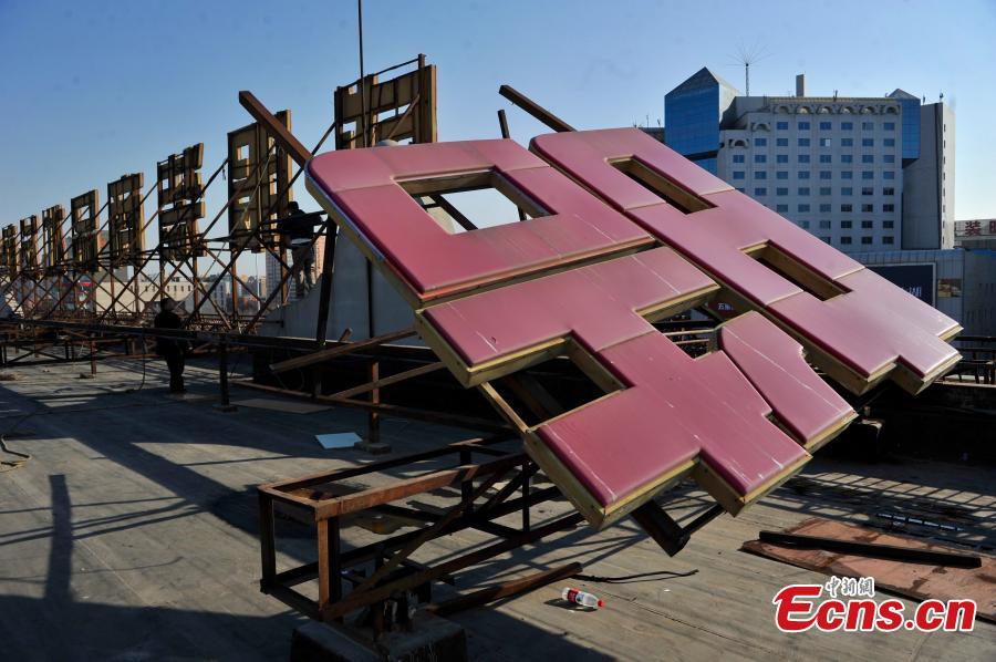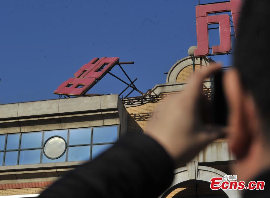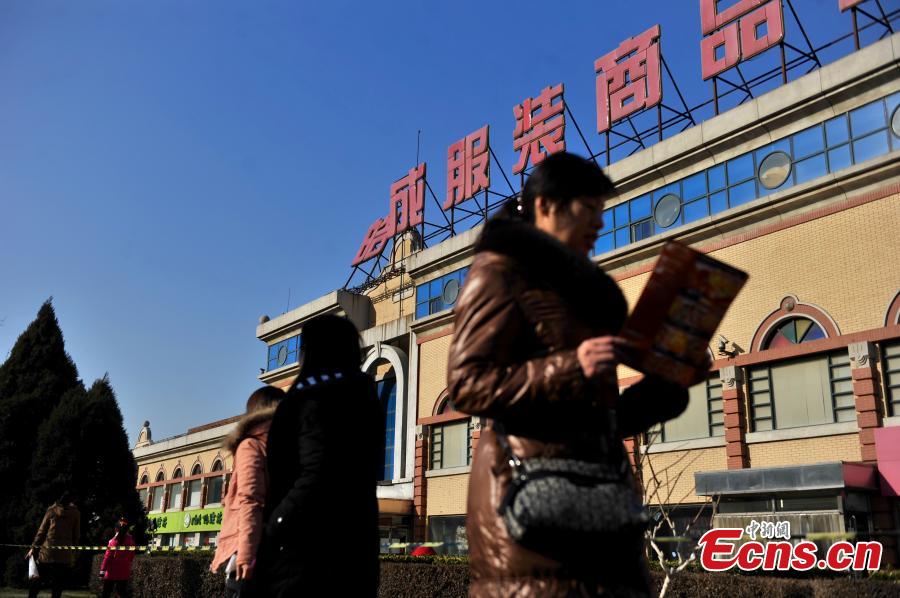 Workers remove signs atop a wholesale mall at Beijing Zoo Market in the city’s Xicheng district on January 11, 2015. The mall named “Tianhaocheng” was the first one in the wholesale market area that had its signs removed. Most wholesalers have already moved out of the mall. With a business area of more than 300,000 square meters and 13,000 stalls, the Beijing Zoo Market represents the largest clothing wholesale distribution center in North China. The relocation project over the market is designed to improve downtown functions and relieve overcrowding and traffic jams. [Photo: chinanews.com/ Jin Shuo]