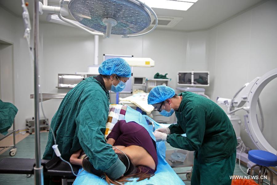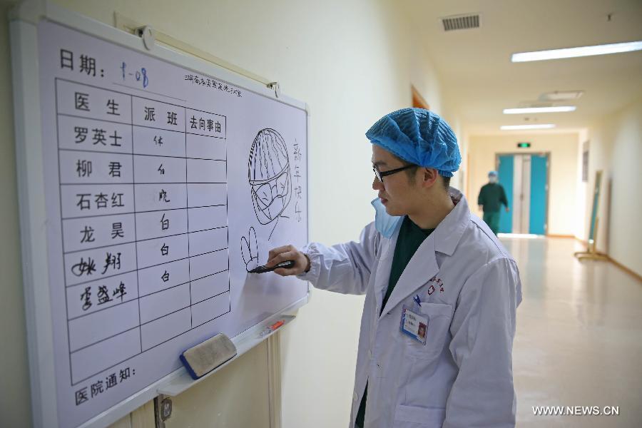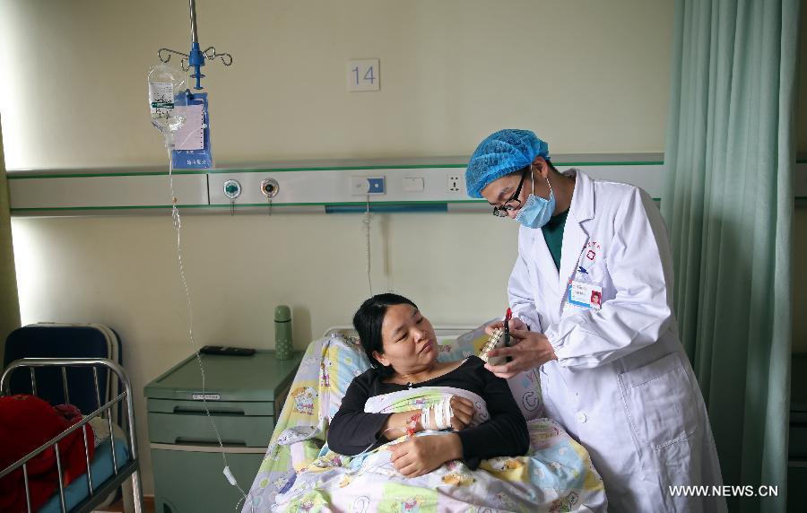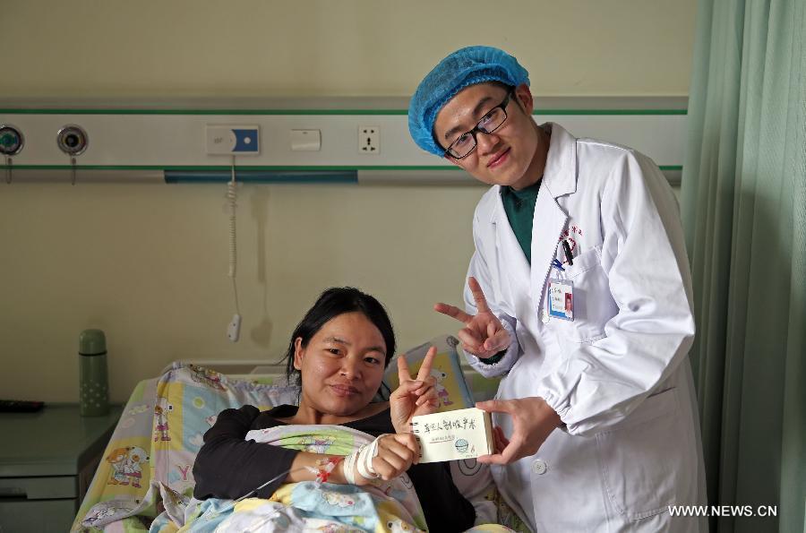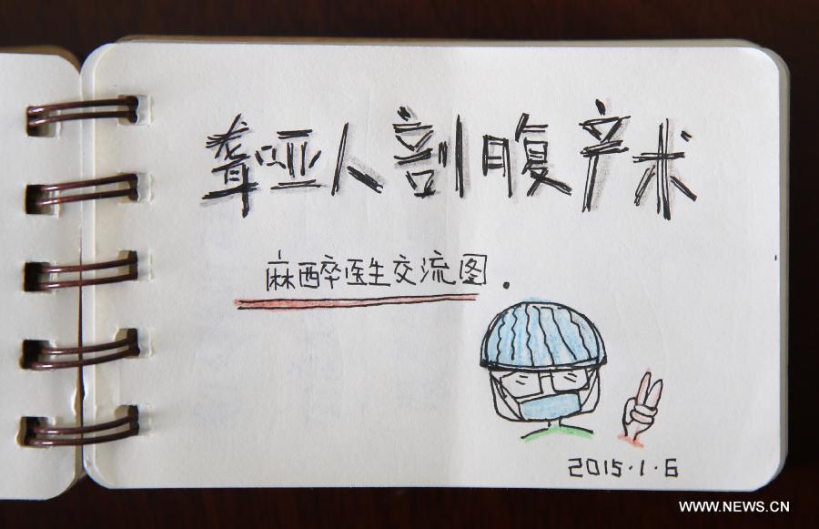 Assistant anesthetist Yao Xiang (R) and deaf-mute puerpera Xu Juan pose for a photo at a ward in Changsha, capital of central China's Hubei province, Jan 8, 2015. The 26-year old assistant anesthetist Yao Xiang communicated with a deaf-mute puerpera through his cartoon work and inform her of important matters of operation. (Xinhua/Li Ga)