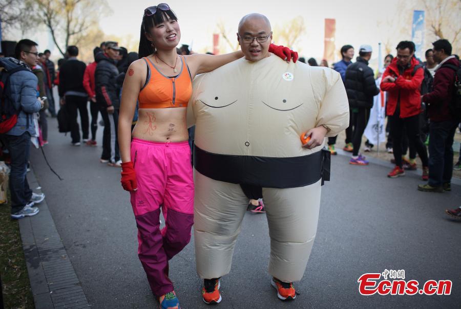 Contestants take part in an Undie Run near the Xuanwu Lake in Nanjing, East China’s Jiangsu province, Jan 11, 2015. More than 300 people joined in the run themed “Dare to be yourself” to raise public awareness of fitness and environmental protection. Similar running events were also organized in other Chinese cities.[Photo: China News Service/Yang Bo]