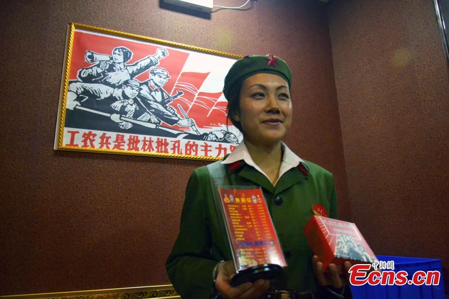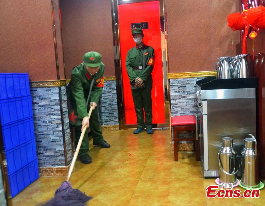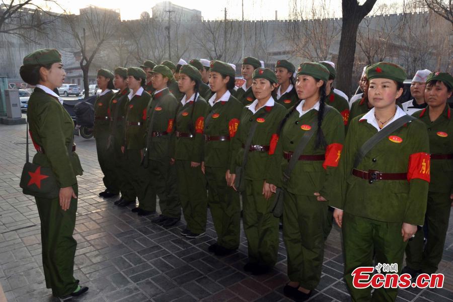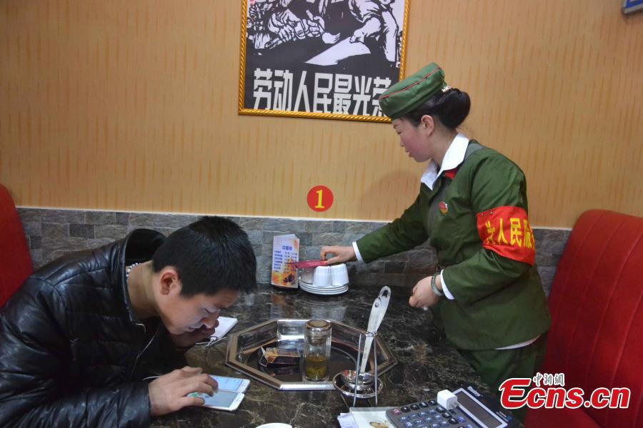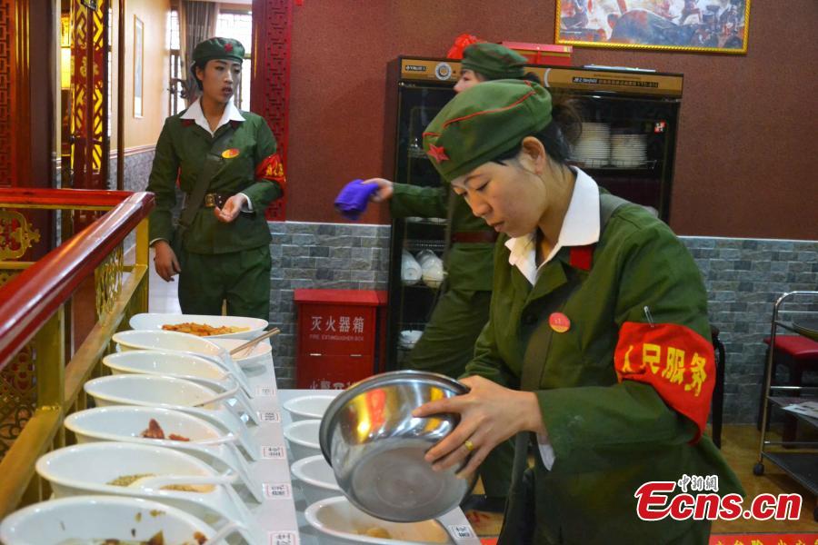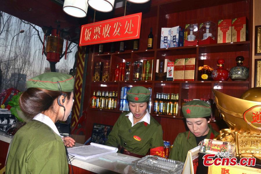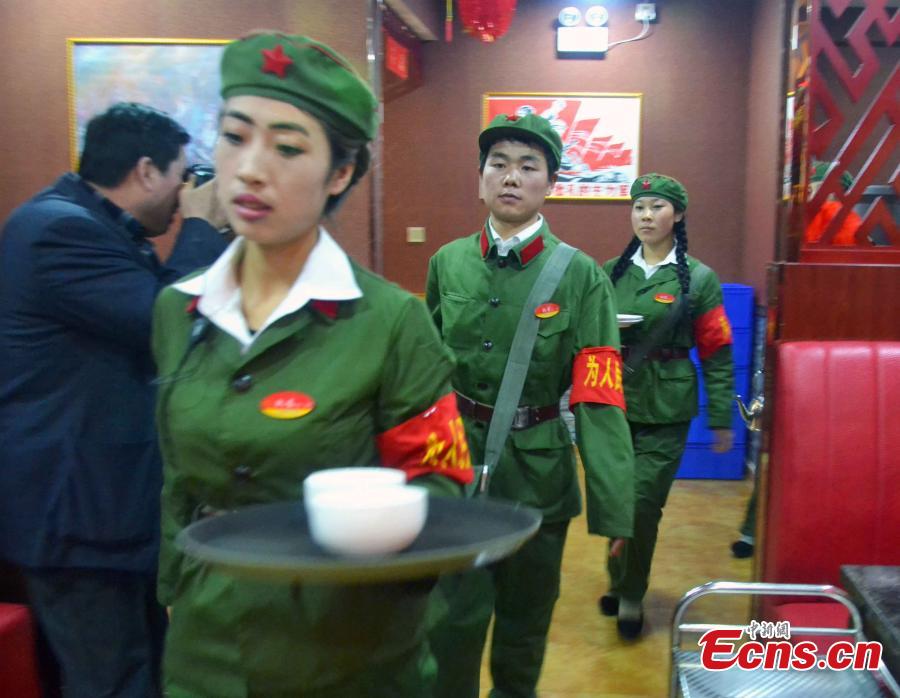 Waiters and waitresses, dressed as “Red guards,” work in a hotpot restaurant in Pingliang, Northwest China’s Gansu province on January 11, 2015. The restaurant themed “red classic” is decorated with posters from the 1960s and 1970s. Workers of the restaurant also adopt languages reminiscent of the old period. Consumers of the restaurant are greeted with messages of ”Welcome to the countryside, hope you enjoy the special meal here.” [Photo: China News Service/ Zheng Bing]