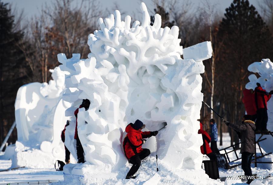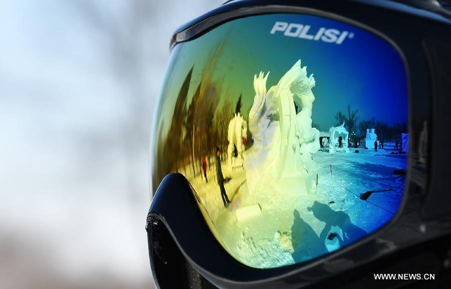 An image reflected in a pair of skiing glasses shows sculptors working on snow sculptures during the 20th Harbin International Snow Sculpture Contest in Harbin, capital of northeast China's Heilongjiang province, Jan 12, 2015. Over 100 snow sculptors from 12 countries attended the four-day contest, which kicked off Saturday in Harbin. (Xinhua/Wang Jianwei)