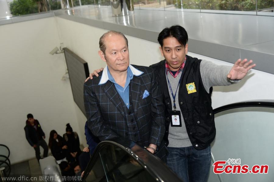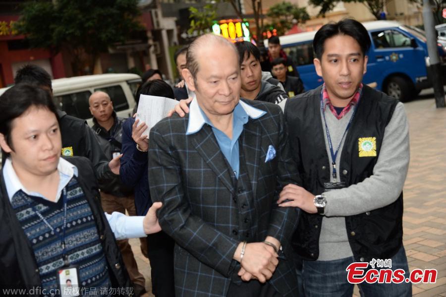 Alan Ho(L), nephew of Stanley Ho, the “King of Gambling” in Macao, is sent to the public prosecutor in Dynasty Plaza, Macao, Jan 12, 2015. Alan Ho was arrested for allegedly running a prostitution ring. In this biggest prostitution ring busted by Macao’s police since its establishment as Macao Special Administrative Region, 102 suspects including 6 suspected ringleaders and 96 suspected prostitutes were arrested. This ring ran for over one year with an earning of over 400 million yuan ($64.5 million).[Photo/IC]