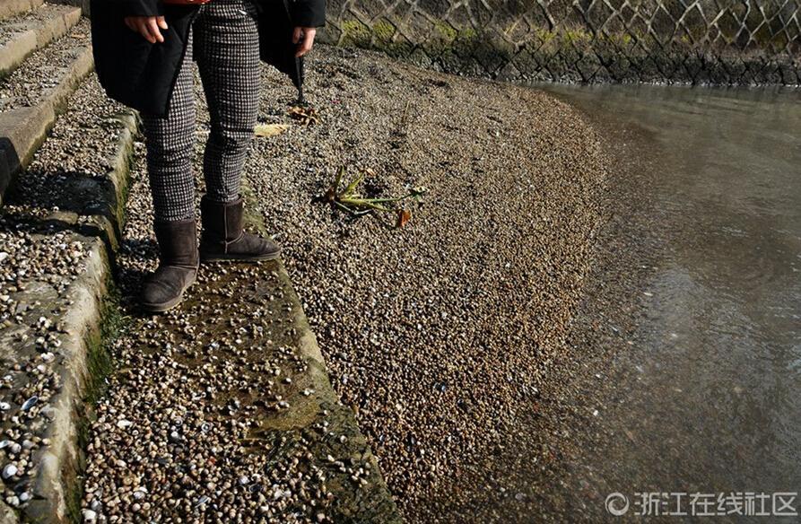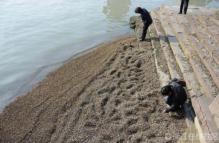 Large number of dead freshwater snails are seen piled at a dock of the Beijing-Hangzhou Grand Canal in Hangzhou. The dead and rotten shells pollute water in the canal and release odor, posing health risks to local residents. Local fisherman said those snails died in the dock after being dumped here by those who were intended to set them free. Setting animals free is considered by Buddhists as an act of compassion that will be rewarded with good karma. [Photo/zjol.com.cn]