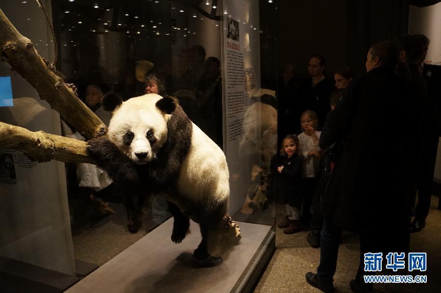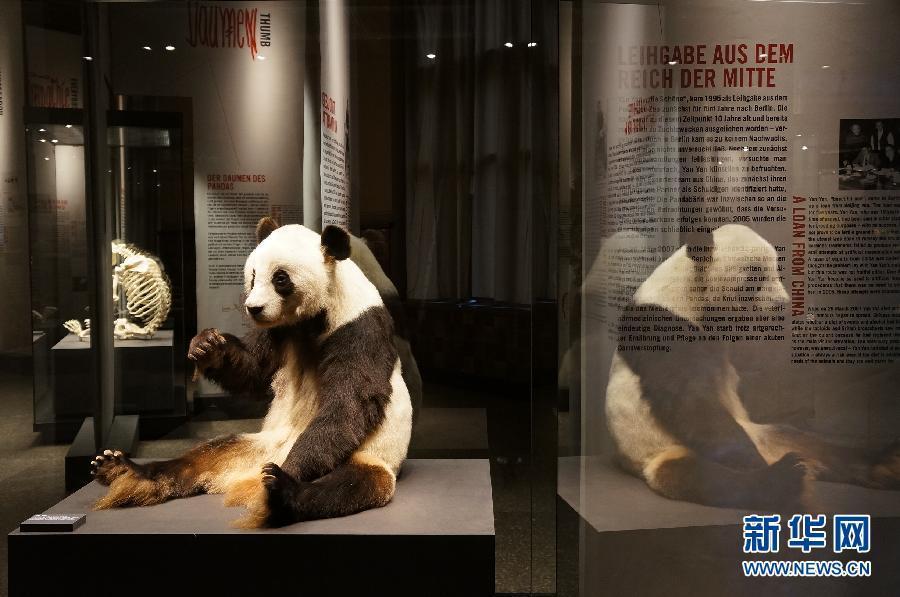 The specimen of a giant panda is displayed at the Natural History Museum in Berlin, Germany, Jan 13, 2015. A panda exhibition opened Tuesday at the museum and specimens of pandas Bao Bao, presented as a gift to Berlin zoo in 1980, and Yan Yan, rented to Berlin zoo by China in 1995, are being displayed for the first time. They died in Mar 2007 and Aug 2012 at the zoo respectively. [Photo/Xinhua]