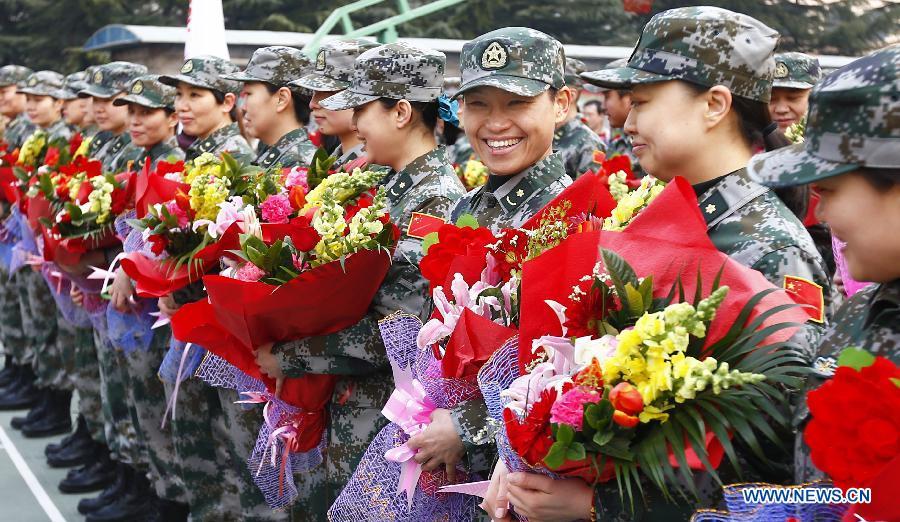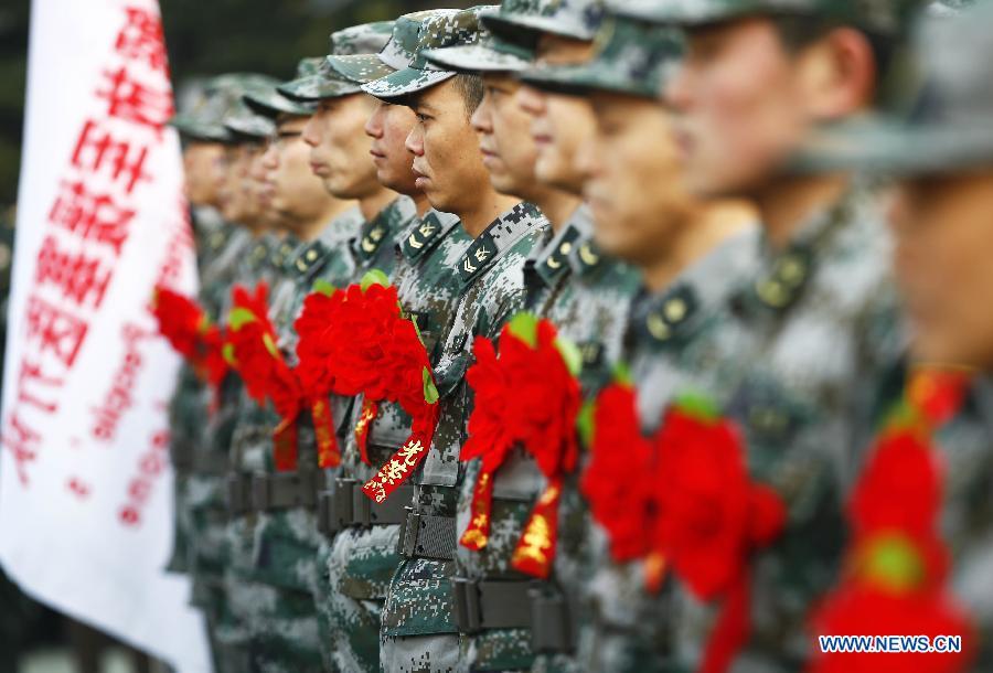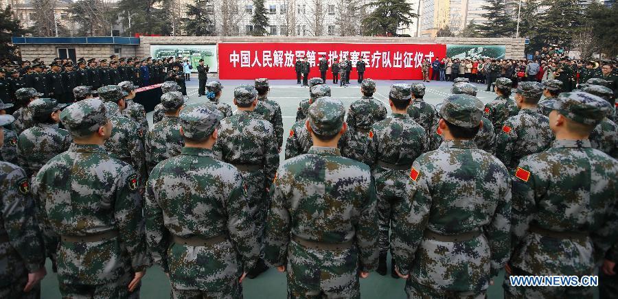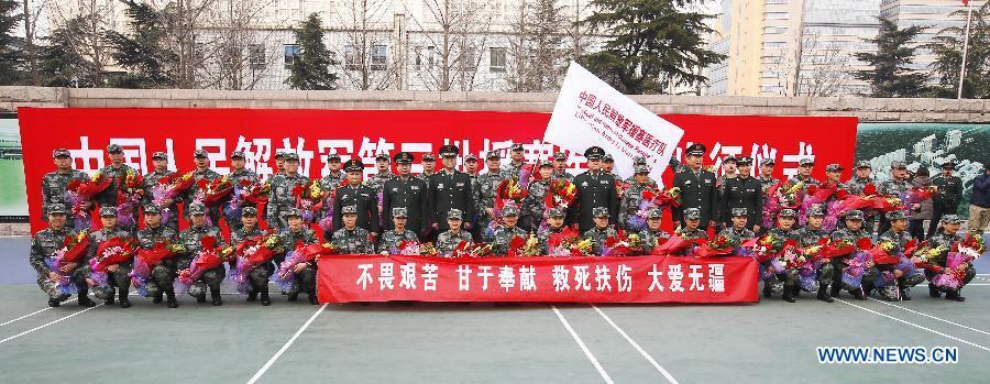Members of the medical aid team of Chinese People's Liberation Army (PLA) to Sierra Leone attend a departing ceremony in Beijing, capital of China, Jan 13, 2015. The third dispatch of the medical aid team of Chinese PLA to Sierra Leone who will leave for Sierra Leone to help in the fight against Ebola, held a departing ceremony in Beijing on Tuesday. (Xinhua/Yin Gang)