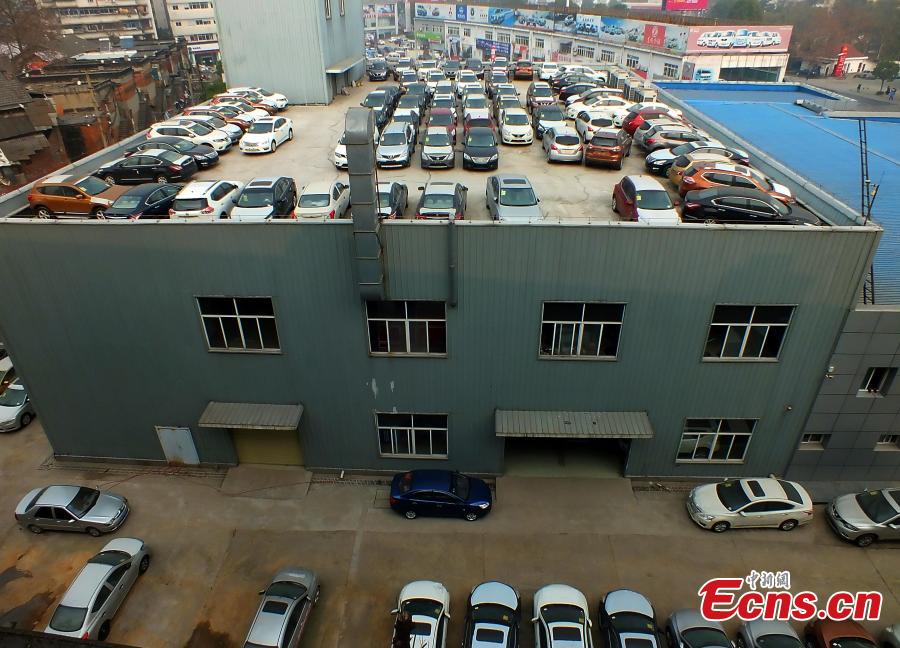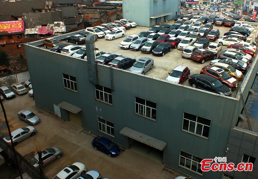 Unsold cars of a 4S auto store (authorized franchisee offers sales, spare parts and services) are parked on the roof a building in Yichang, Central China’s Hubei province, Jan 13, 2015. [Photo: China News Service/Liu Junfeng]