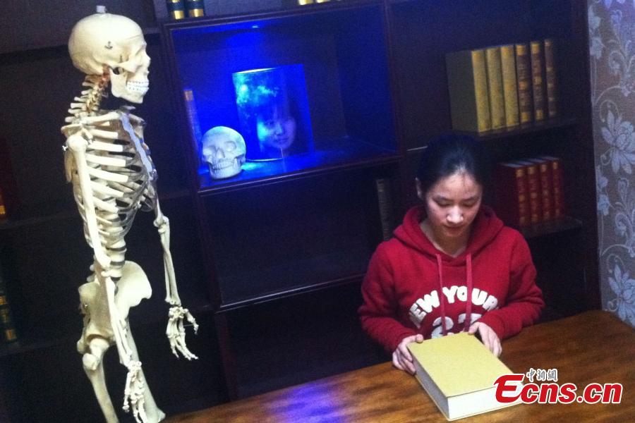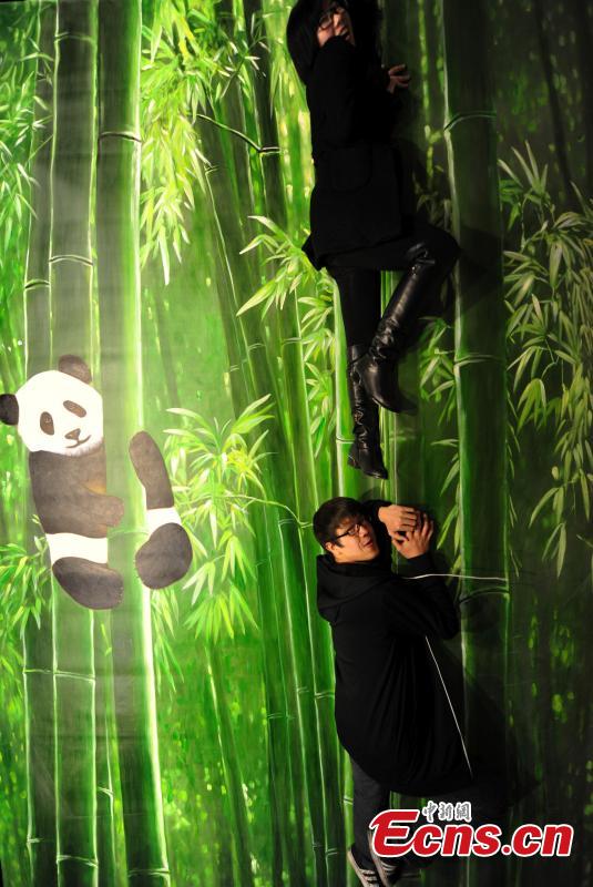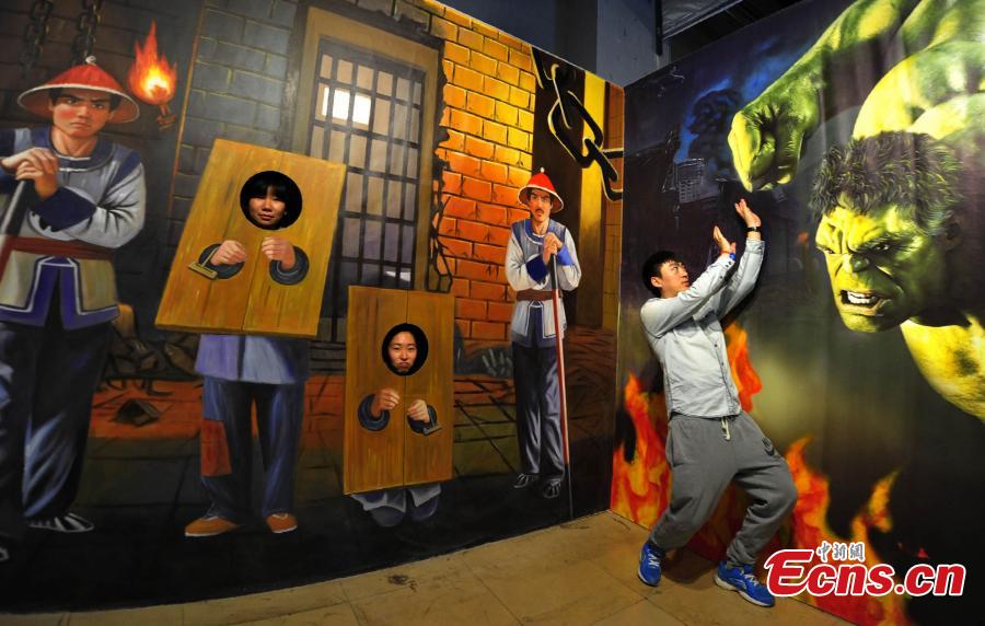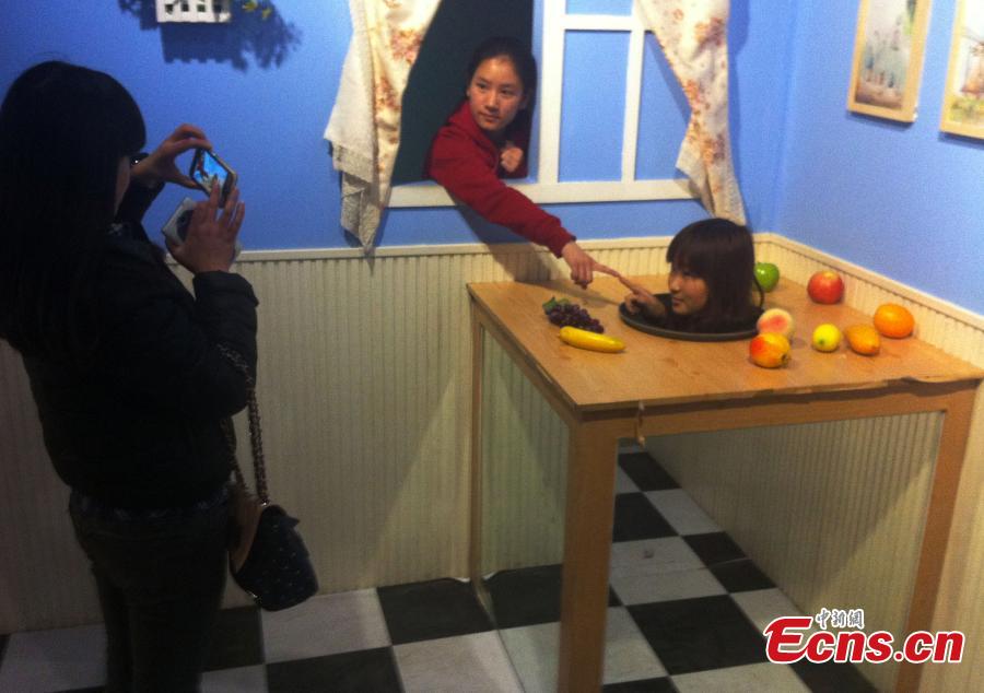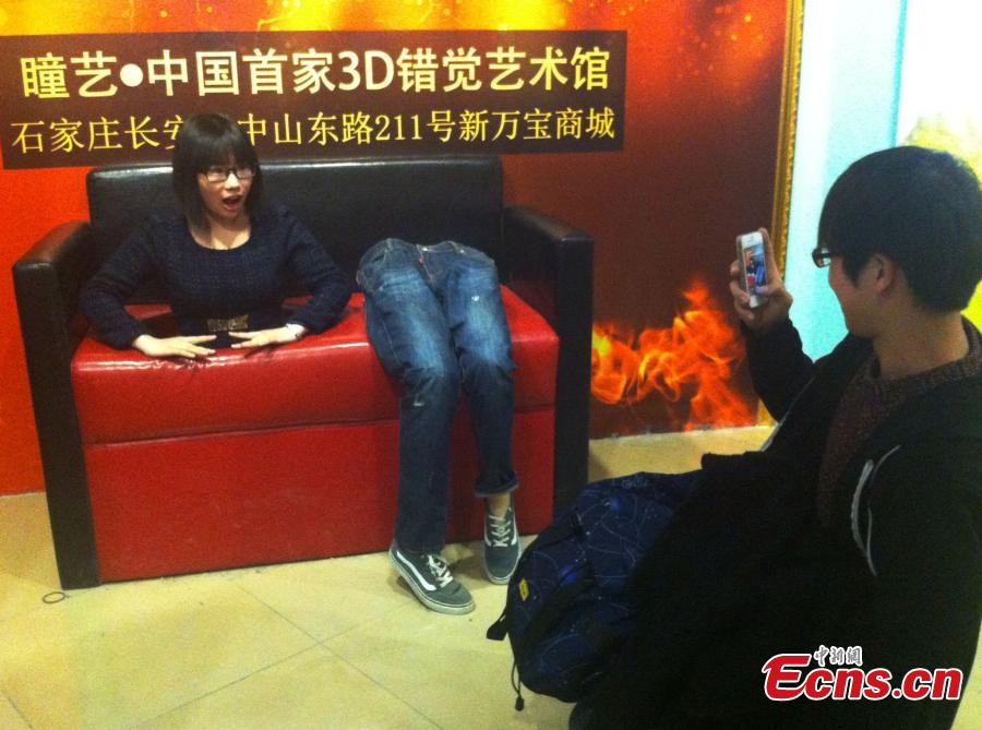 A visitor poses for a photo inside a room that uses 3D paintings and sculptures to create optical illusions at a museum in Shijiazhuang, North China's Hebei province, Jan 13, 2015. The center provides more than 100 types of optical illusions to visitors. [Photo: China News Service/Zhai Rujia]