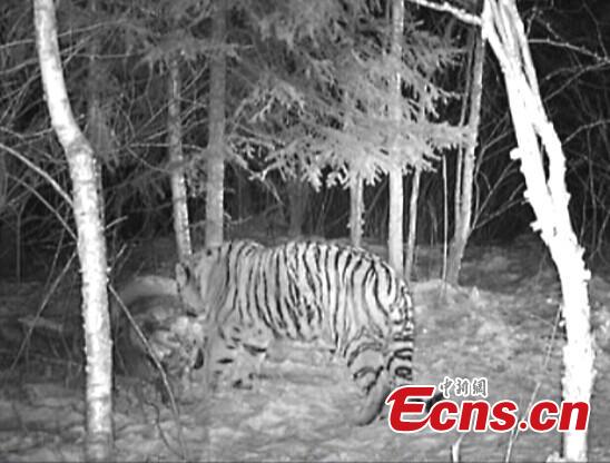 A robust adult wild Siberian tiger eats a dead horse near a stable in Ning'an, Heilongjiang province. Images of the tiger were captured on cameras set in the area by local wildlife officials following previous attacks, according to a provincial forestry industry bureau on January 13, 2015. It is the first time that a wild Siberian tiger is spotted in the area. [Photo provided by Heilongjiang forest industry bureau]