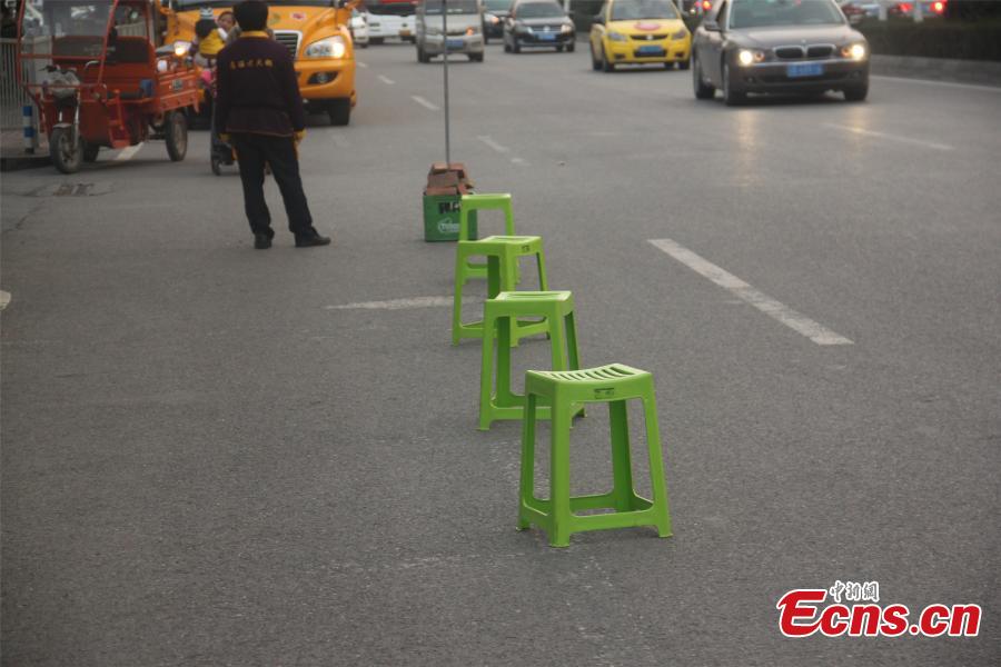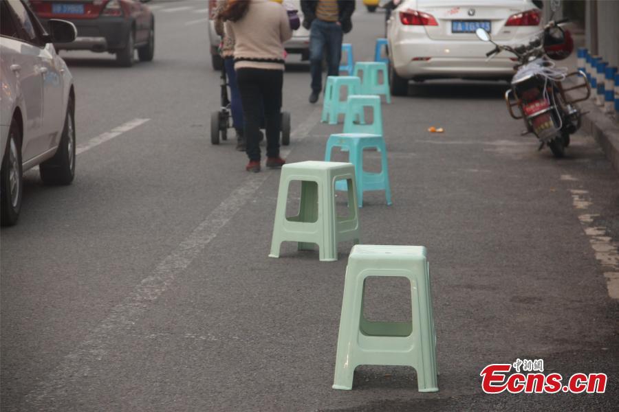 Plastic stools are placed on the ground to make reservations for parking space in front of a restaurant in Chongqing municipality, Jan 13, 2015. [Photo: China News Service/Dai Lu]