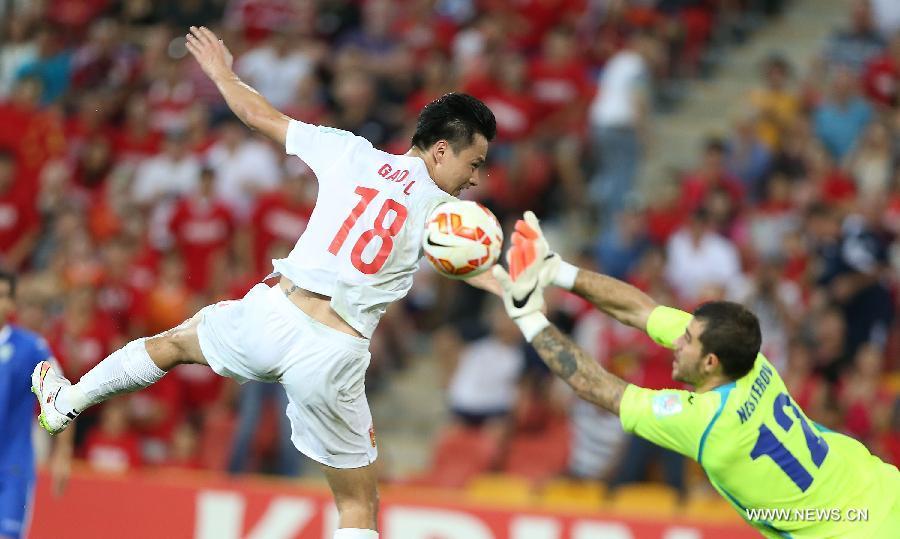 Ignatiy Nesterov, goalie of Uzbekistan, saves the ball as Gao Lin (L) of China misses a chance during a Group B match between China and Uzbekistan of the AFC Asian Cup in Brisbane, Australia, Jan 14, 2015. (Xinhua/Cao Can)