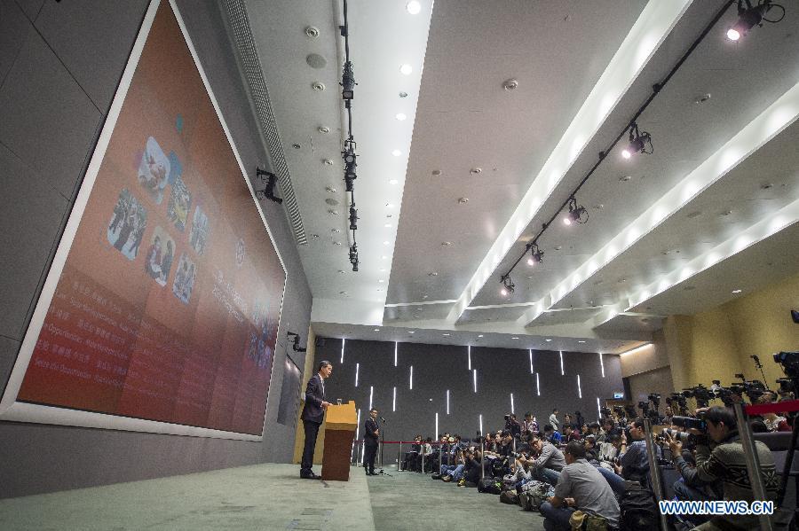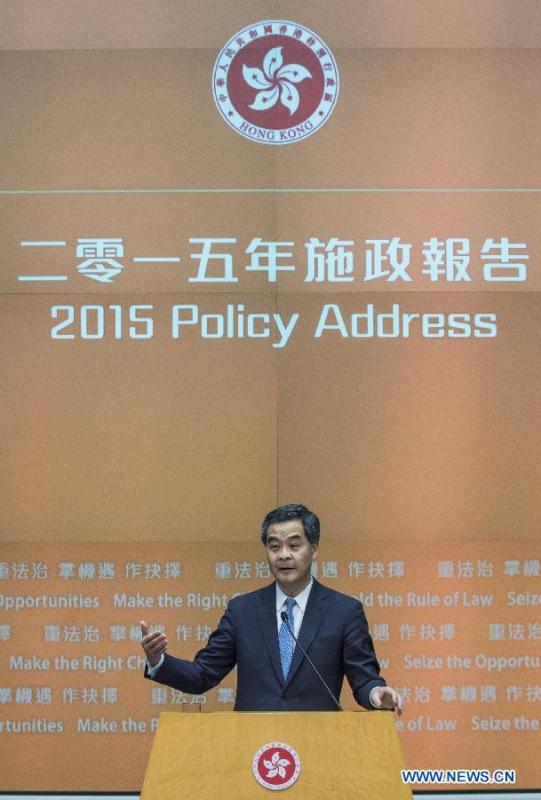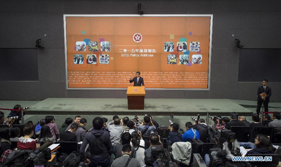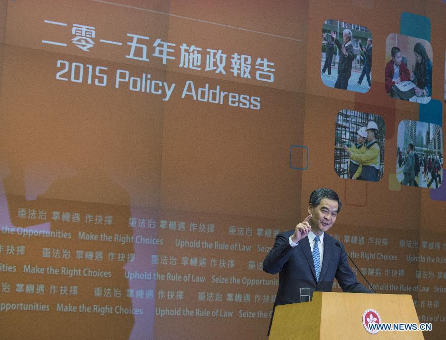 Leung Chun-ying, Chief Executive of the Hong Kong Special Administrative Region, speaks at a news briefing on the 2015 Policy Address in Hong Kong, south China, Jan 14, 2015. (Xinhua/He Jingjia)