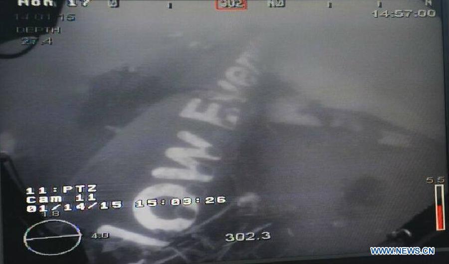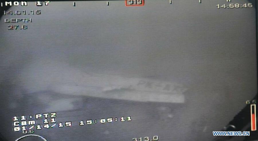 Photo posted on the facebook page of Defense Minister of Singapore Ng Eng Hen on Jan 14, 2014 shows the main fuselage of the crashed AirAsia plane. The main fuselage of the crashed AirAsia plane has been found, Indonesian officials said on Wednesday. Divers were deployed down for a visual check on the jet's main body and it is confirmed after pictures containing the AirAsia logo which reads "Now Everyone can fly" are taken by a remotely operated underwater vehicle, said Ng Eng Hen, the Defense Minister of Singapore, on his facebook page. (Xinhua)