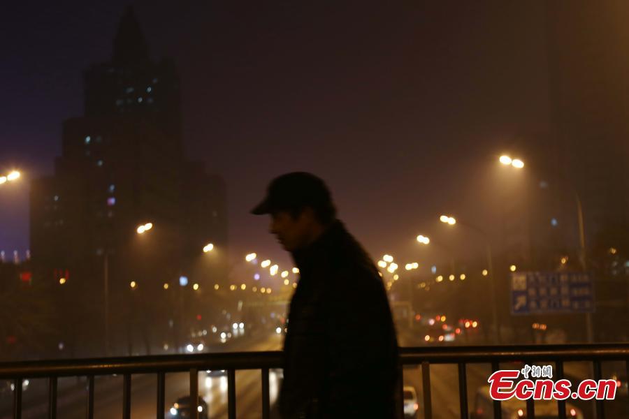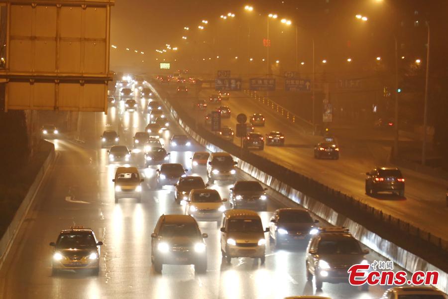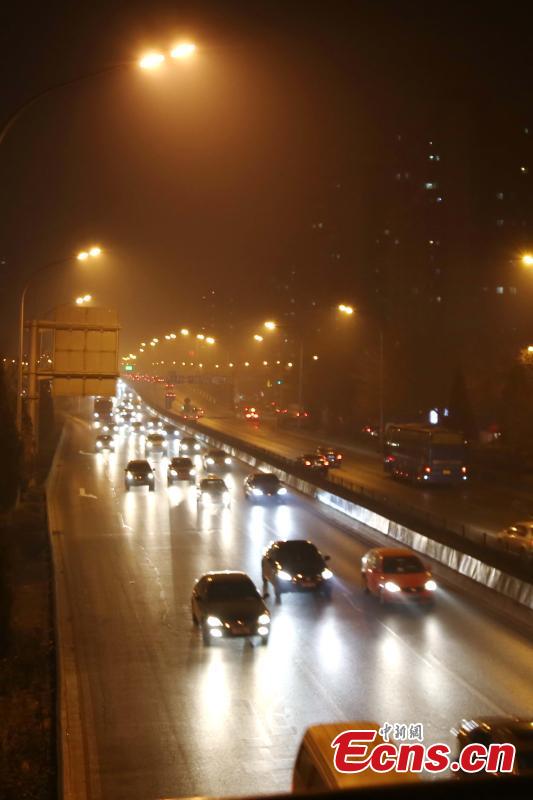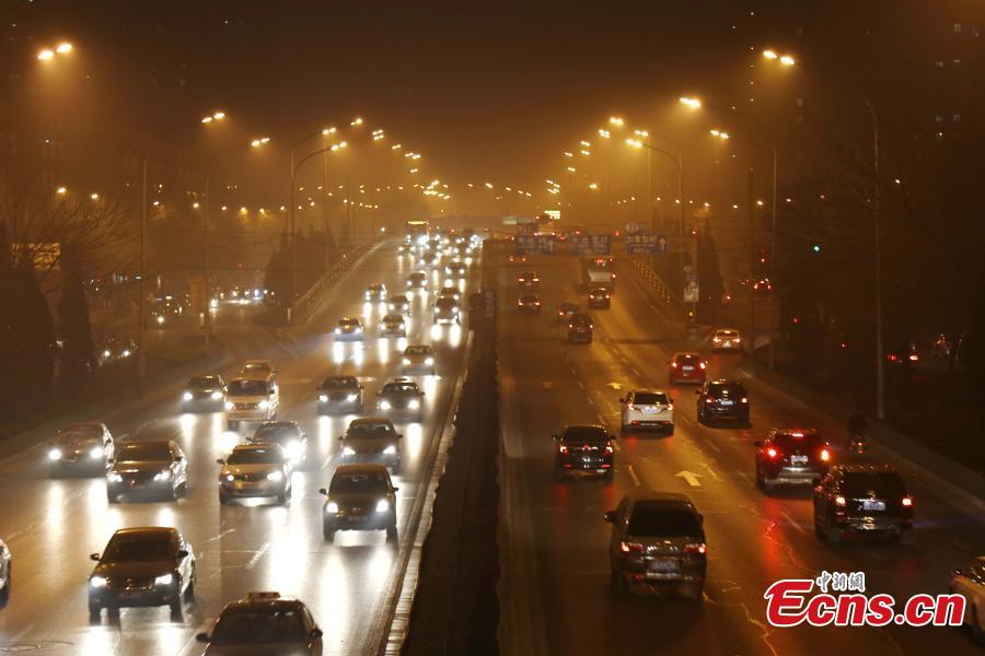 Vehicles make their way along a road on a smoggy day in Beijing, Jan 14, 2015. Beijing issued a yellow alert for air pollution on Wednesday with smog forecast to continue on Thursday. [Photo: China News Service/Wang Xu]