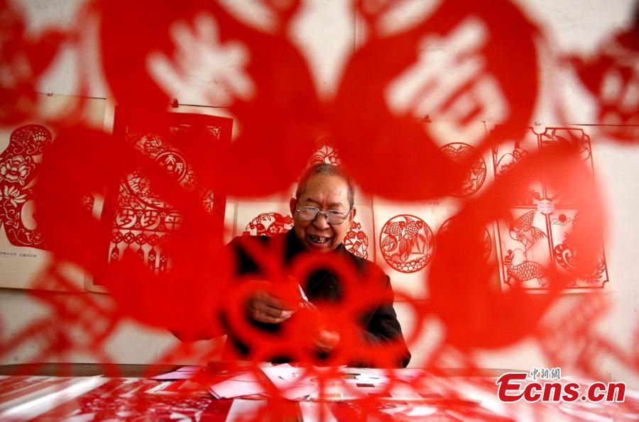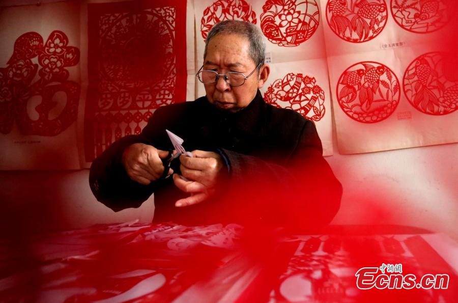 Folk artist Lian Delin, nearly 80 years old, works on his paper cutting to celebrate the upcoming Spring Festival, the Lunar New Year, in Zhengzhou, Central China’s Henan province, Jan 14, 2015. Lian, an intangible cultural heritage successor in the province, has created more than 60 vivid paper cuttings of goats of various shapes and sizes for the New Year, which is the Year of the Goat. He started to learn the art when he was five years old. [Photo: China News Service/ Yang Zhenghua]