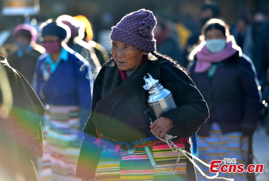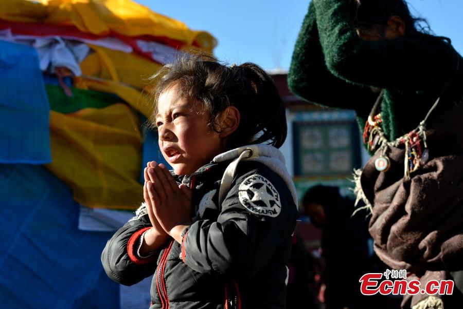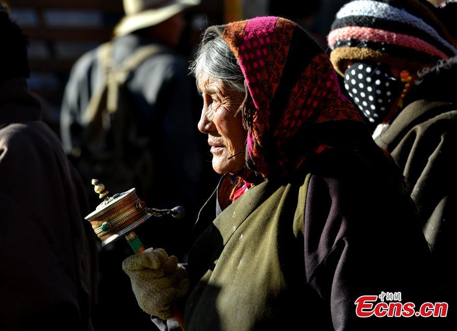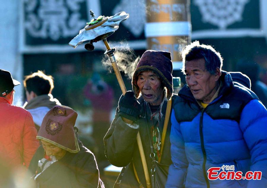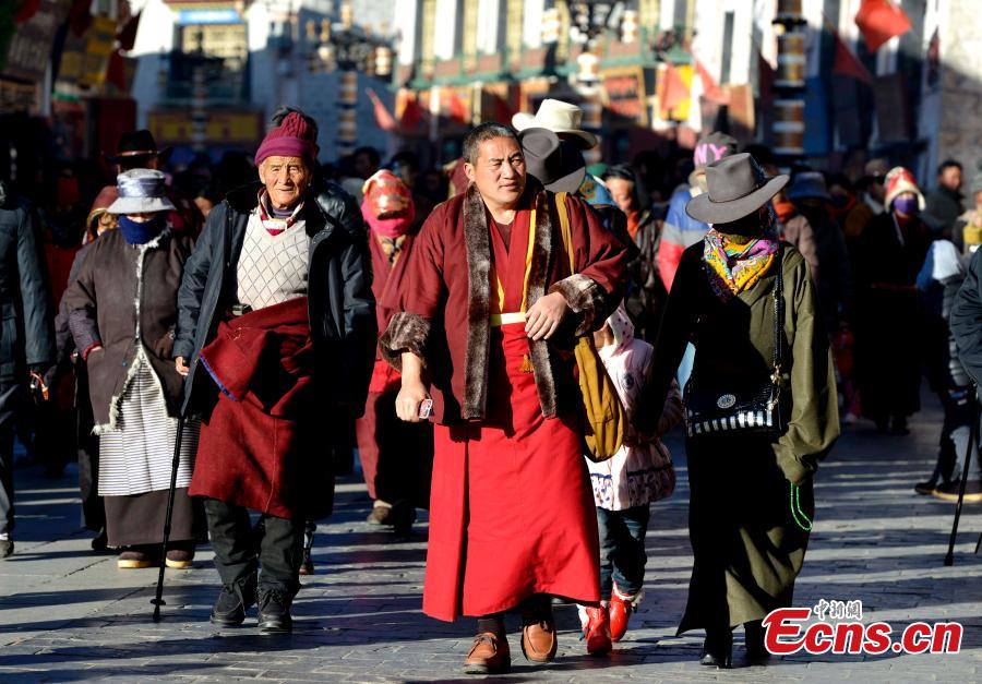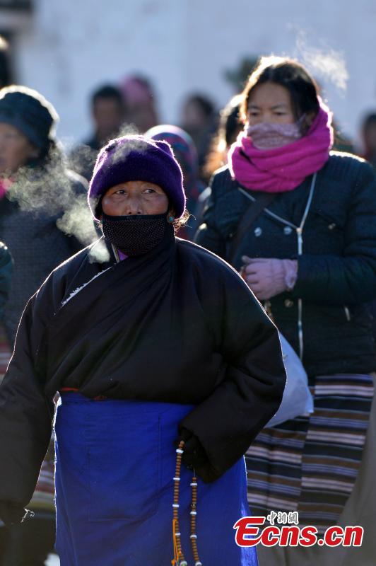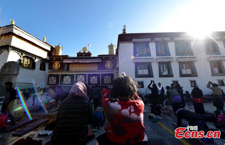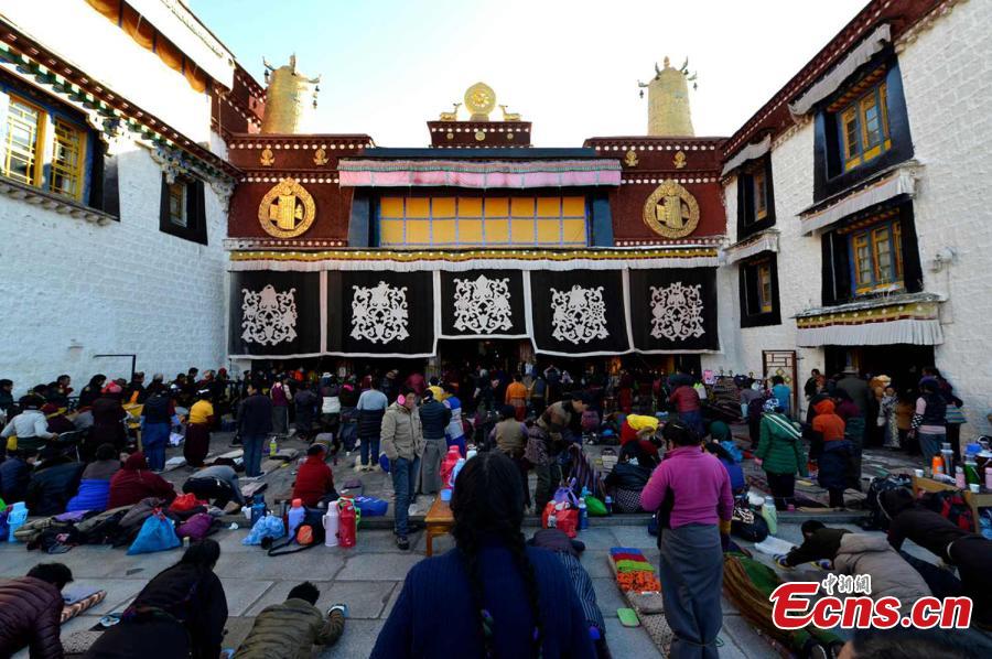 Buddhists kowtow in front of the Jokhang Temple on Jan 13, 2015. Lhasa, capital city of Southwest China's Tibet autonomous region, has entered the worship season. Buddhists from across Tibet come to the Potala Palace and Jokhang Temple for worship.[Photo/ Li Lin]