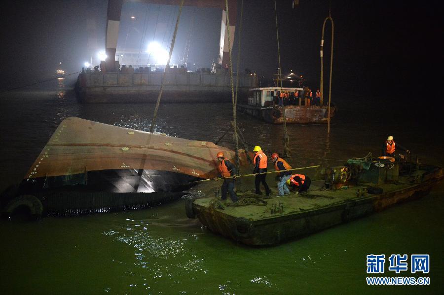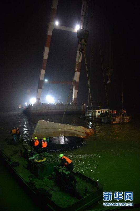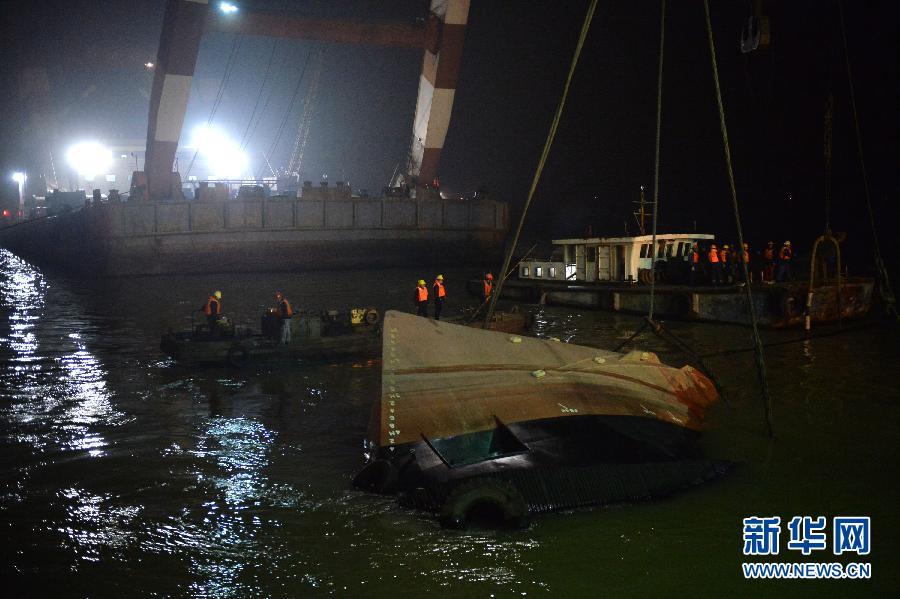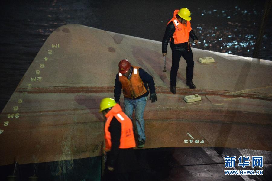 Rescuers work at the site where a tug boat sank in the Yangtze River in east China's Jiangsu province January 15, 2014. More than 20 people are still missing and the search and rescue mission is still underway. (Photo/Xinhua)