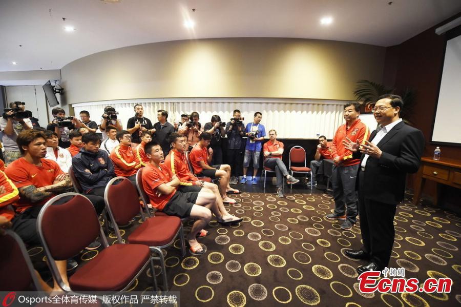 Ma Zhaoxu (C), Chinese Ambassador to Australia, poses with members of China National Football Team at their hotel in Canberra, Australia, Jan 16, 2015. Ambassador Ma took Chinese cuisine, including steamed stuffed buns and spiced beef, and also wished good luck to the team in the 2015 Asian Football Cup. [Photo: Osports]