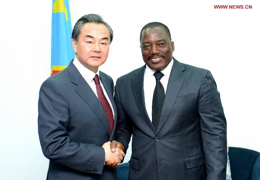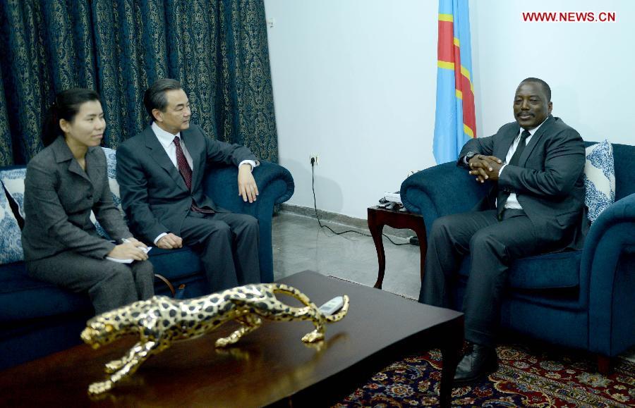 Chinese Foreign Minister Wang Yi (L) meets with President of the Democratic Republic of the Congo Joseph Kabila in Kinshasa, the Democratic Republic of Congo, on Jan. 16, 2014. (Xinhua/Wang Bo)