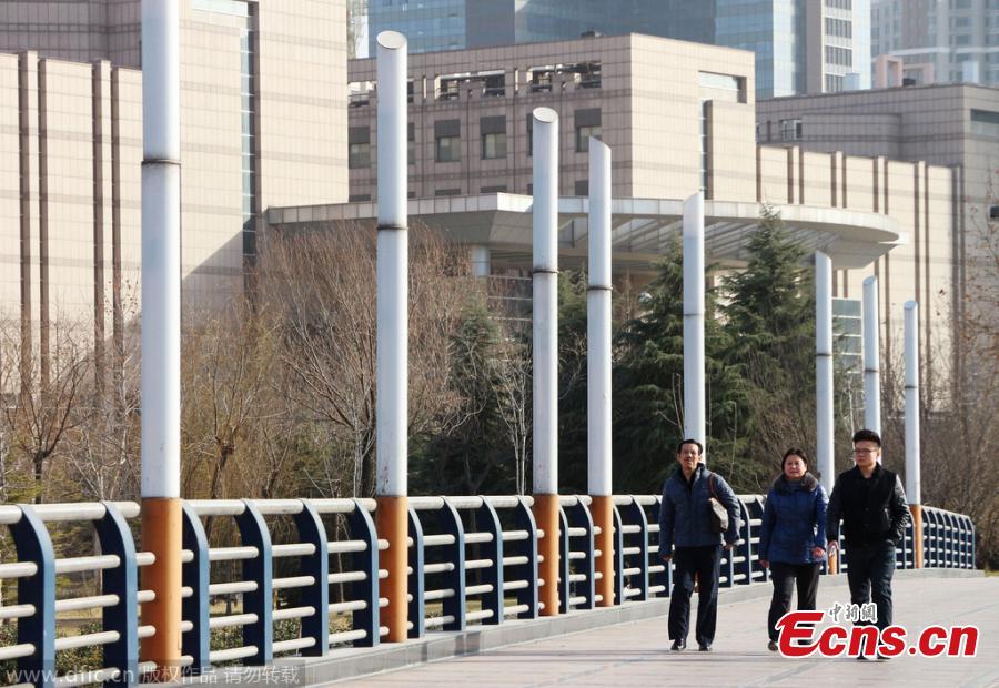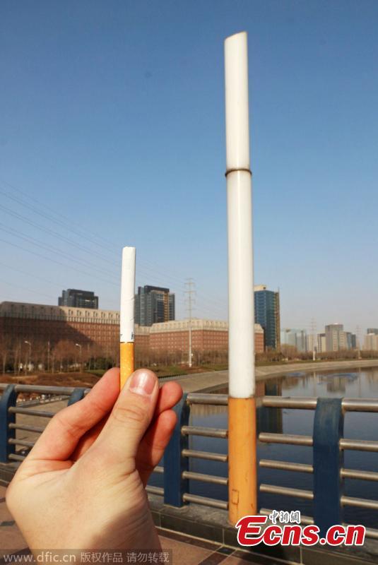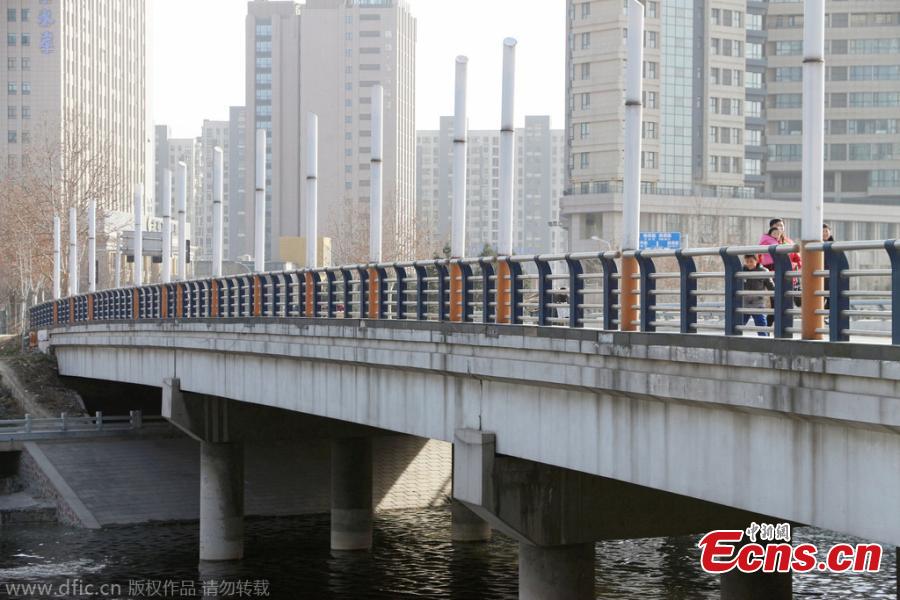 Passengers walk past street lamps on a bridge in Zhengzhou, Central China’s Henan province, Jan 18, 2015. The street lamps have caused debate on the Internet as they look like cigarettes. [Photo/IC]