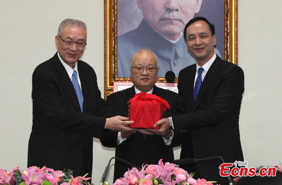 The acting chief of Nationalist Kuomintang Party (KMT) Wu Den-yih (L) hands over the official seal to the newly-elected party chairman Eric Chu (R) in Taipei on Jan 19, 2015. [Photo: China News Service/Lu Mei]