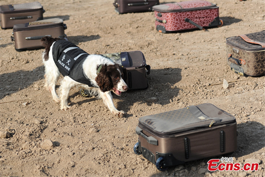A police dog receives trainings such as overcoming obstacles, jumping through a ring of fire, walking on a single-log bridge and detecting explosives in Xi’an, Northwest China’s Shaanxi province, Jan 20, 2015. The railway police authorities organized a 20-day training to ensure security during the Spring Festival travel season. [Photo: China News Service/ Zhang Yuan]