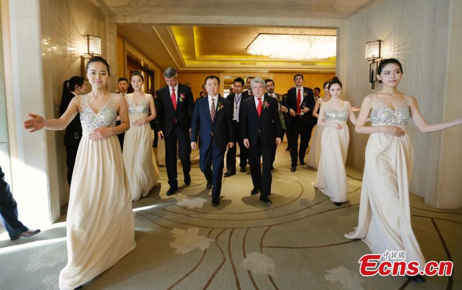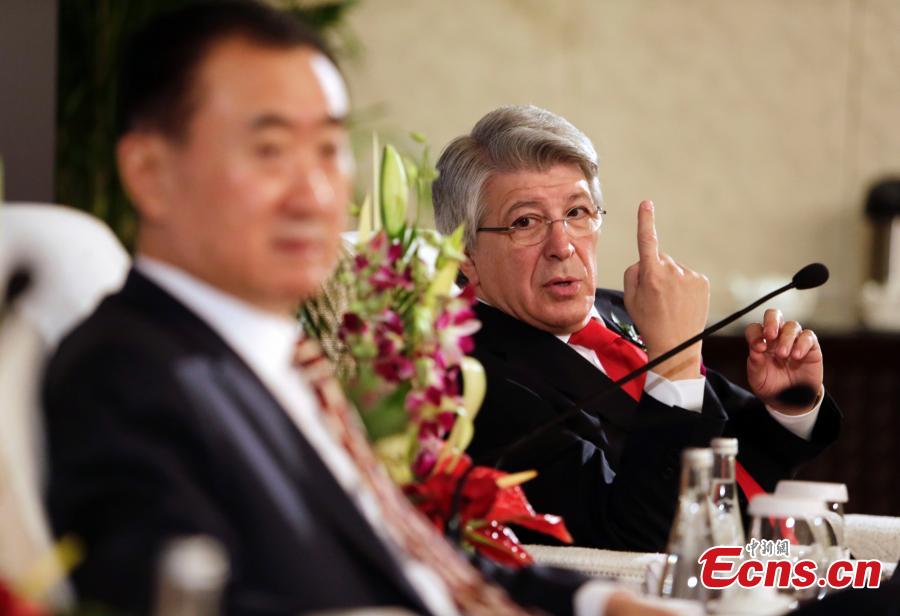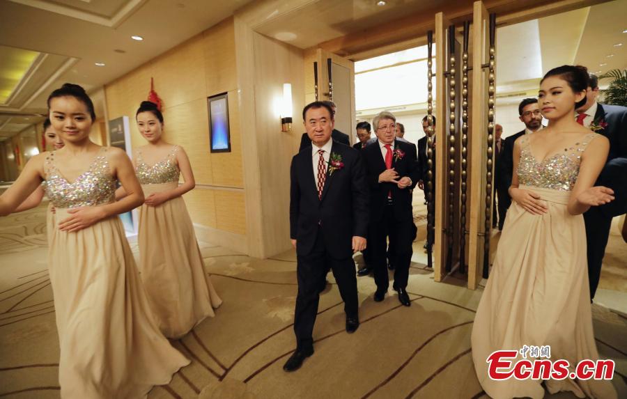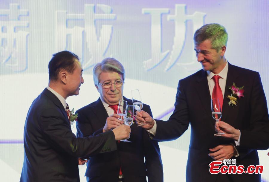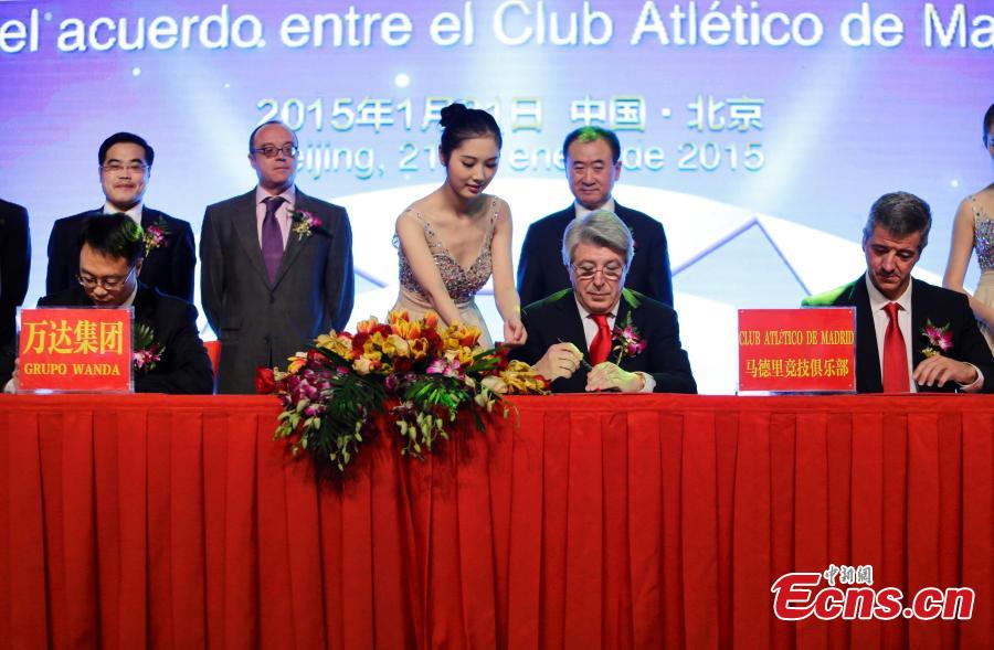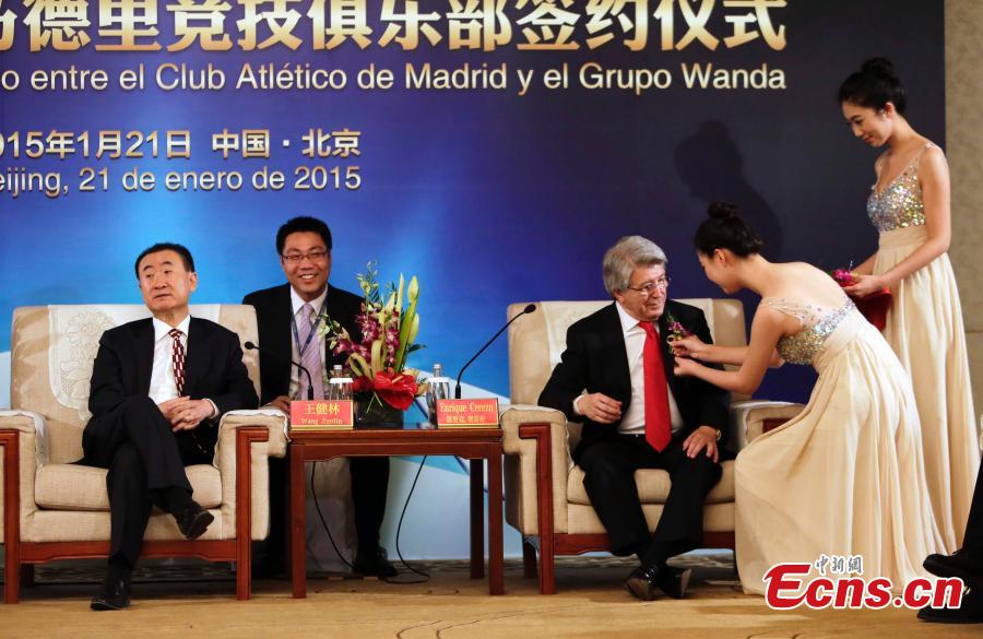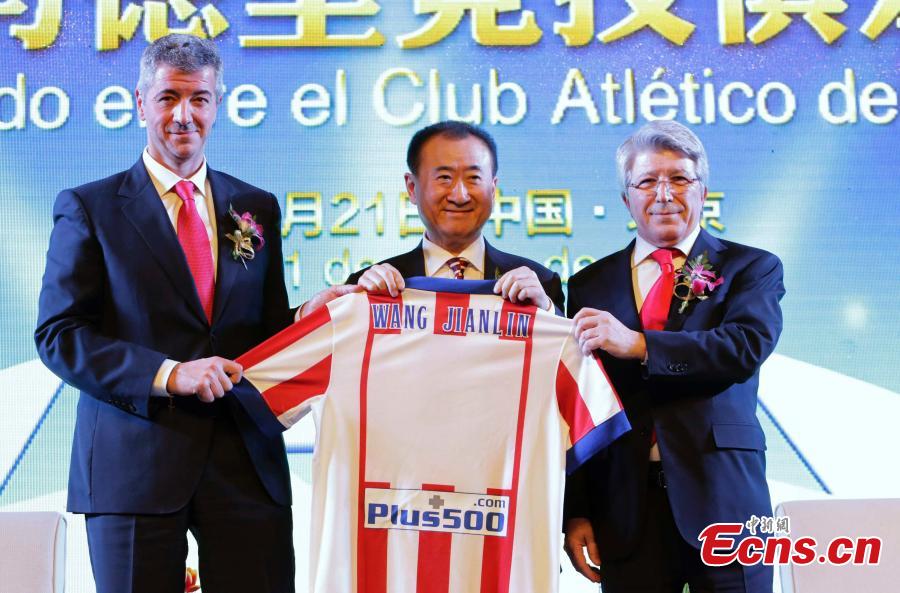 Wang Jianlin (M), chairman of the Dalian Wanda property group, together with Atletico Madrid CEO Gil Marin (L) and club president Enrique Cerezo (R), hold a jersey which features Wang’s name on the back at a signing ceremony in Beijing on Jan 21, 2015. At the event, they announced that Wanda Group agreed to pay 45 million euros ($52 million) for a 20-percent stake in reigning Spanish champion Atletico Madrid. The move is the first Chinese investment in a top-flight European football club. [Photo/Agencies]