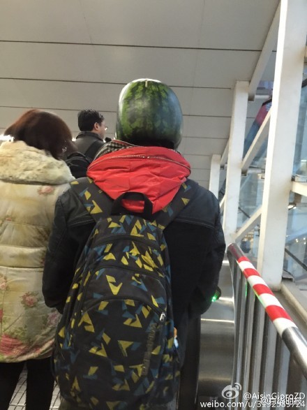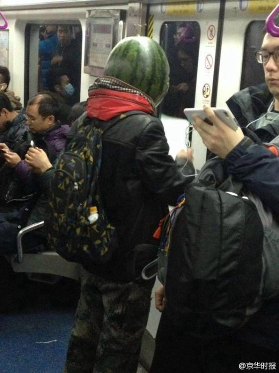 A picture uploaded to Twitter-like Sina Weibo microblogging site shows a passenger wearing watermelon rind mask on a subway train in Beijing. The man, who also brought beer and liquor bottles, was later taken away by police. [Photo: Sina Weibo of the Beijing Times]