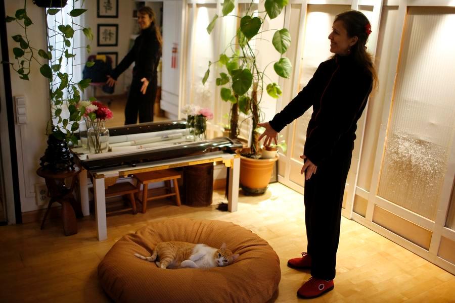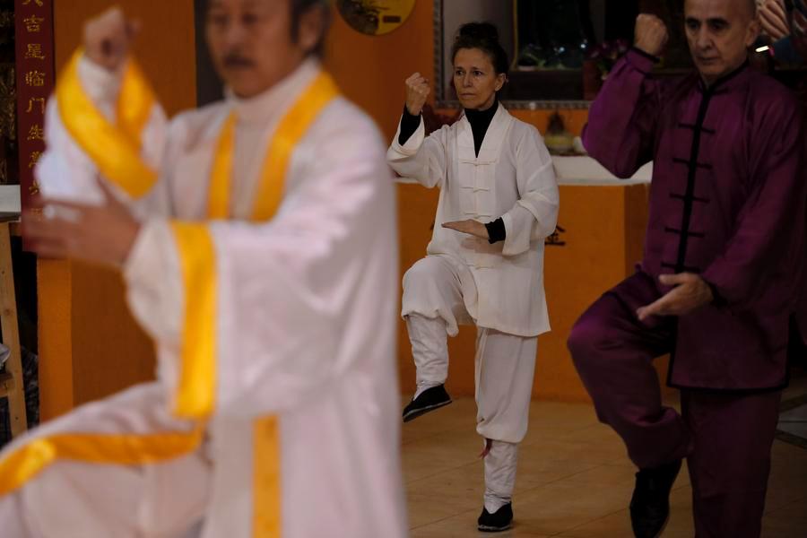 Guadalupe practices tai chi in a Taoist abbey in Barcelona, Spain, Dec 5, 2014. [Photo/Xinhua]