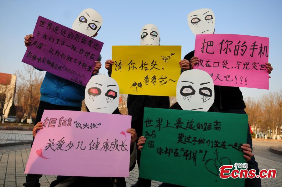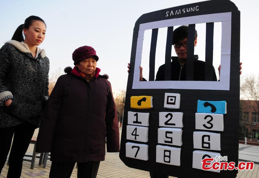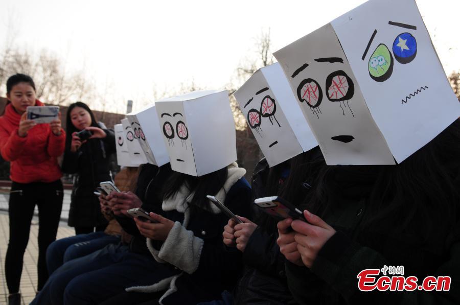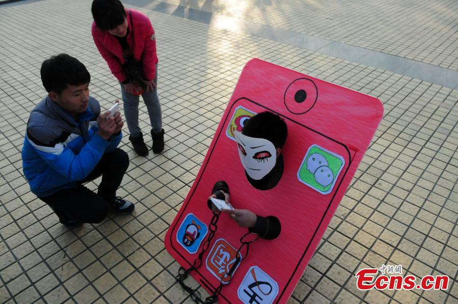 Students from School of Fine Arts, Liaocheng University perform during an event about too much dependence on mobile phone on a street in Liaocheng, East China’s Shandong province, Jan 22, 2015. In the show, students call for public awareness of obsession with mobile phone and potential influences of the device on interpersonal relationship. Those students said they hope the campaign can help promote family communications during the upcoming Spring Festival, China’s Lunar New year. [Photo: China News Service/Zhang Zhenxiang]