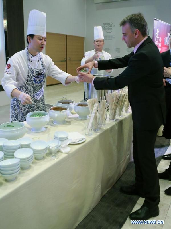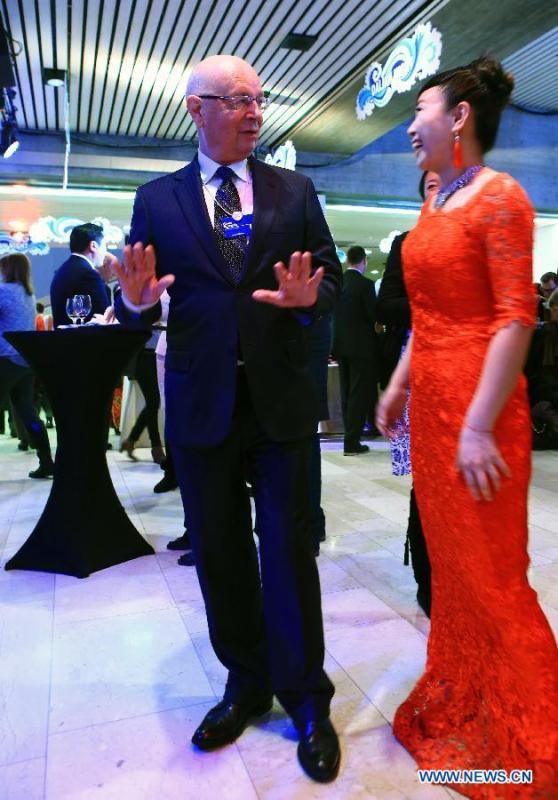 Olivier Schwab (R), executive director of the World Economic Forum (WEF) China, attends the "Dalian Night" reception during the WEF annual meetings in Davos, Switzerland, Jan 22, 2015. The Summer Davos meeting, or the Annual Meeting of the New Champions, will be held in the Chinese city of Dalian on Sept 9-11 this year. (Xinhua/Luo Huanhuan)
