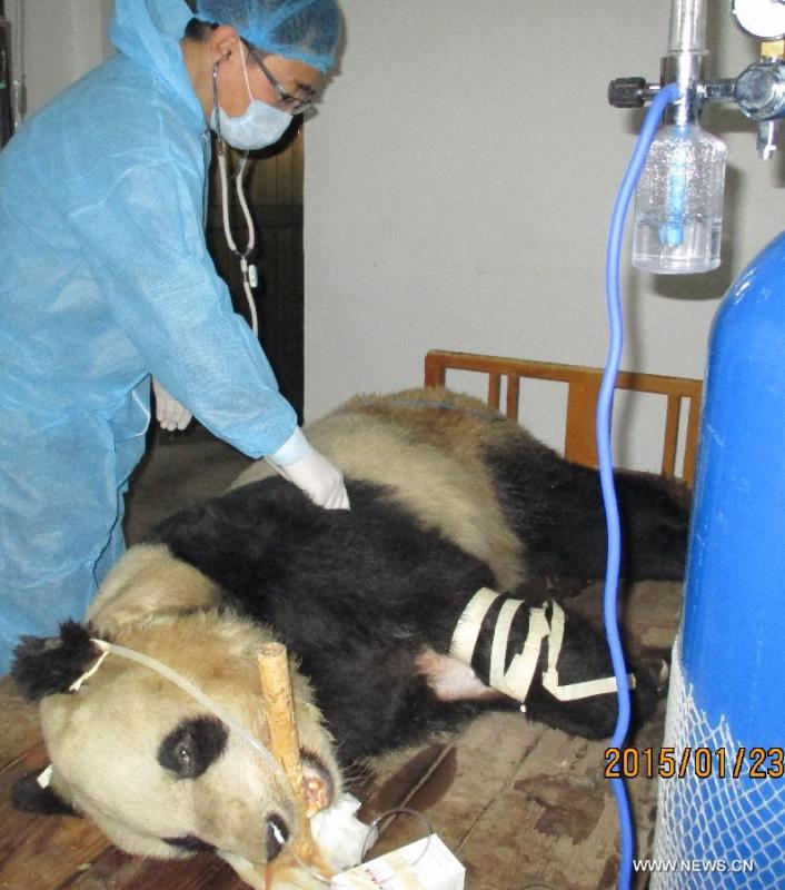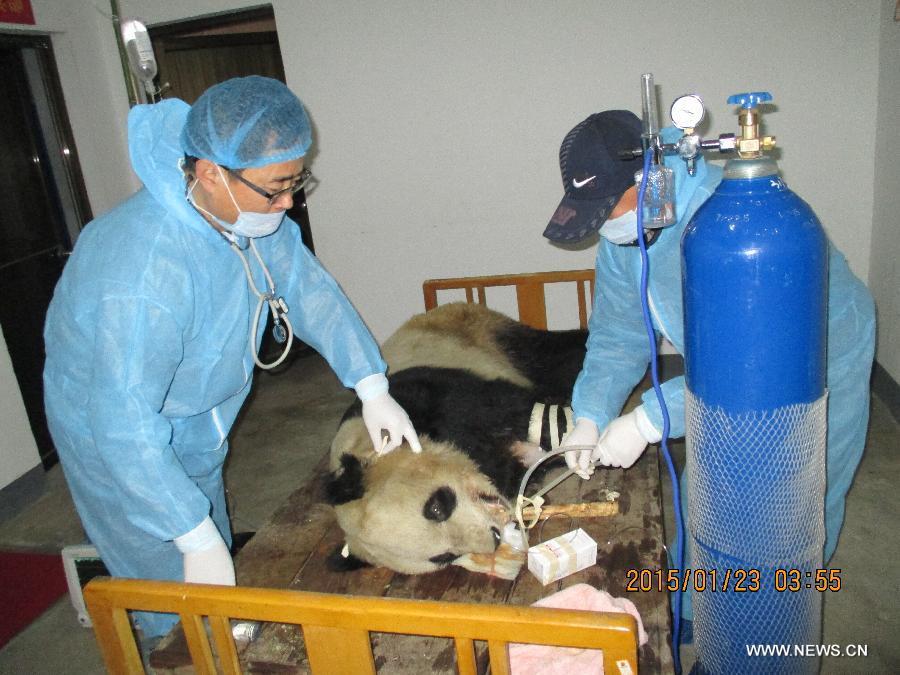 A veterinarian checks on giant panda Xin Xin at the provincial wildlife rescue, breeding and research center, northwest China's Shaanxi Province, Jan. 23, 2015. A third giant panda, 9-year-old Xin Xin, died Friday after contracting canine distemper virus (CDV), local authorities said. (Xinhua)
