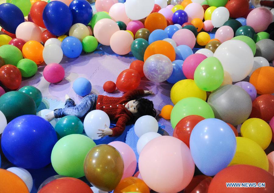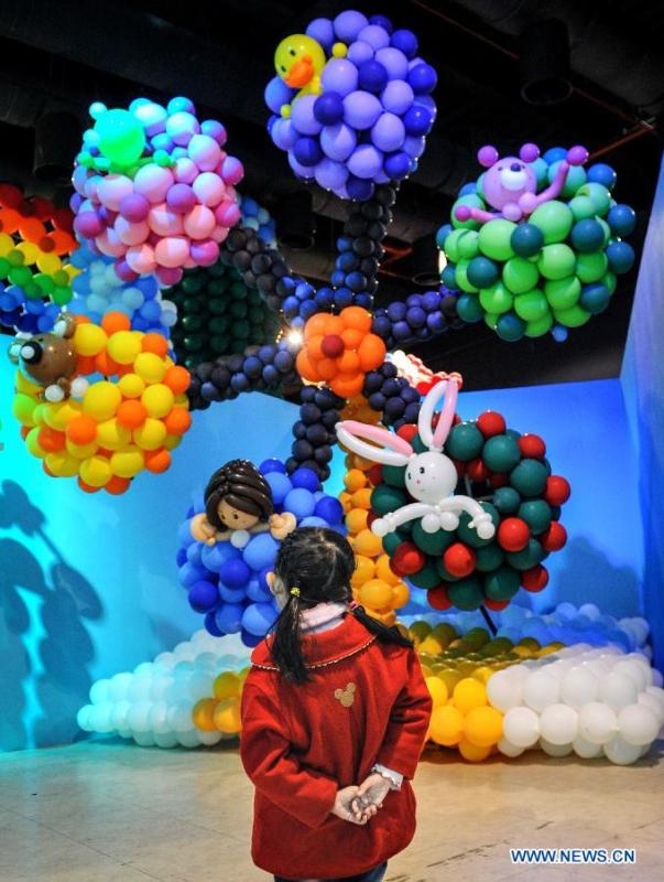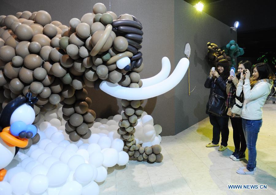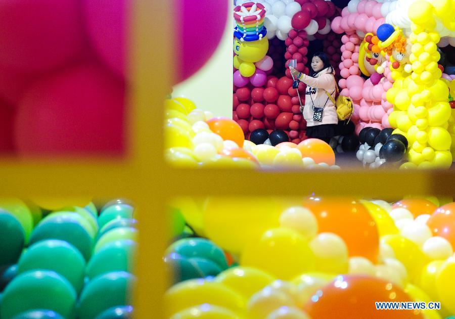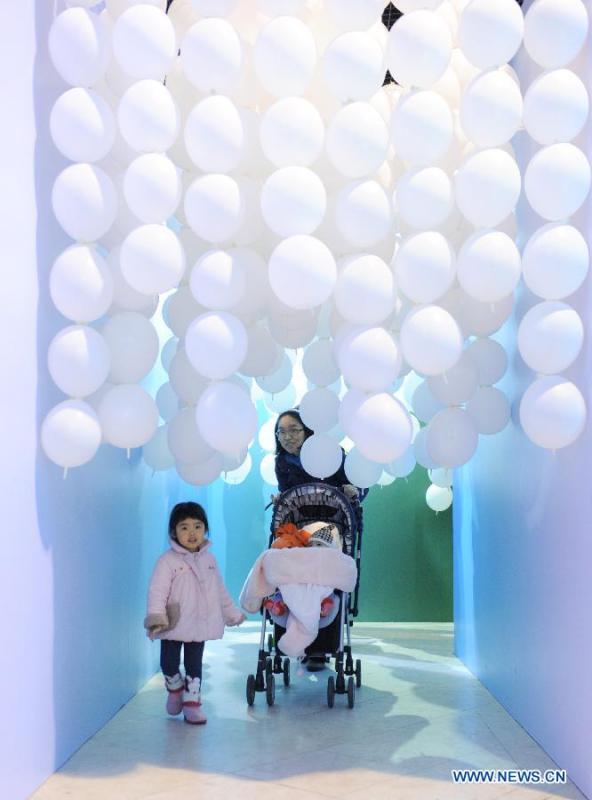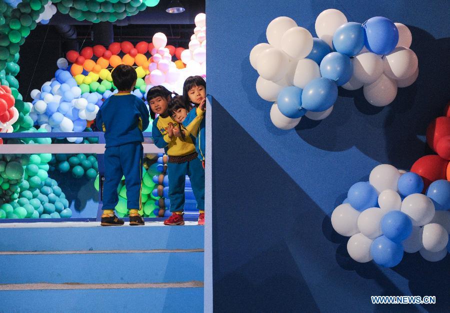A woman takes her children to an exhibition of balloons at Taiwan Science Education Center in Taipei, southeast China's Taiwan, Jan. 23, 2015. A total of 300,000 balloons were applied to creat various shapes and figures. (Xinhua/Shen Hong)