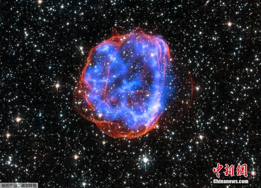 An expanding shell of debris called SNR 0519-69.0 is left behind after a massive star exploded in the Large Magellanic Cloud, a satellite galaxy to the Milky Way, as seen in this undated NASA handout image released January 23, 2015. Multimillion degree gas is seen in X-rays from Chandra, in blue. The outer edge of the explosion (red) and stars in the field of view are seen in visible light from the Hubble Space Telescope. (Photo Source: chinanews.com/NASA)