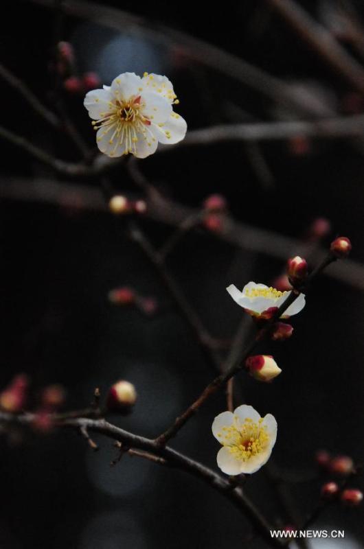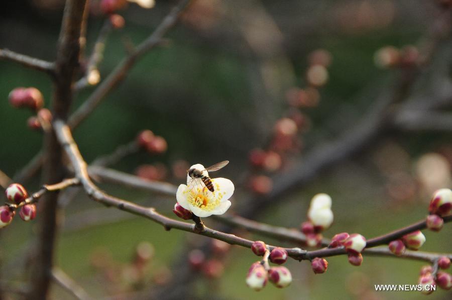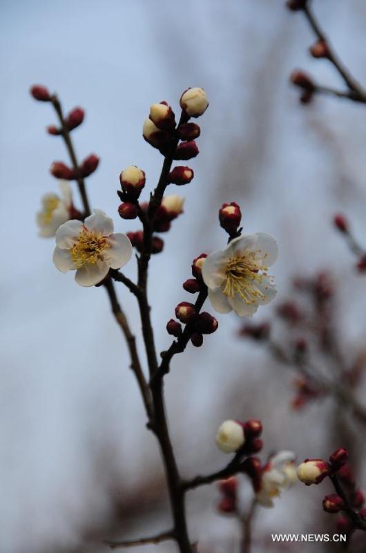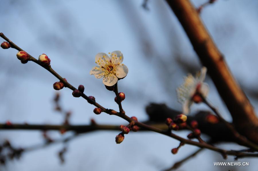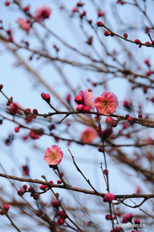 Photo taken on Jan 24, 2015 shows plum blossom at the botanic garden of Hangzhou, capital of east China's Zhejiang province. The temperature of Hangzhou reached 24 degrees Celsius Saturday, the highest of this winter. (Xinhua/Li Yabiao)