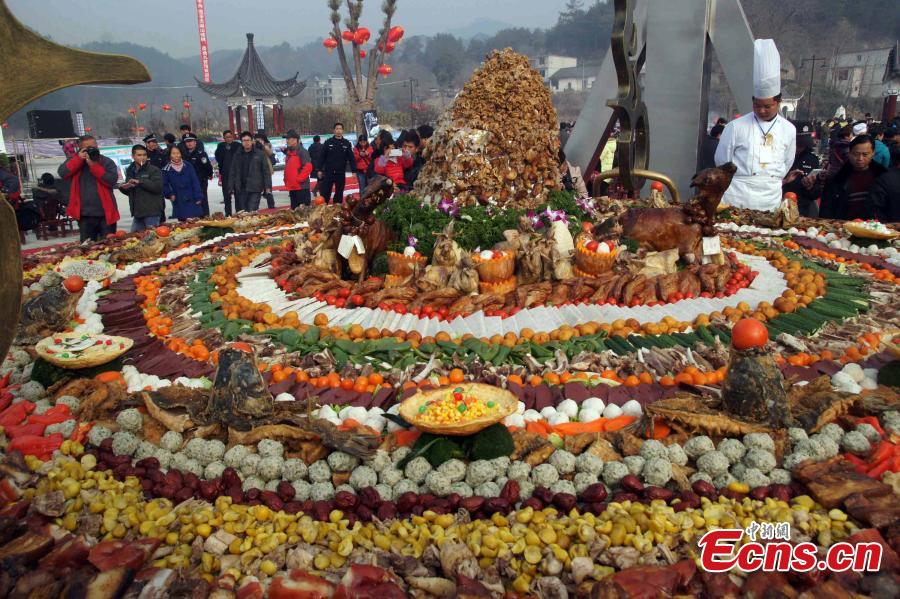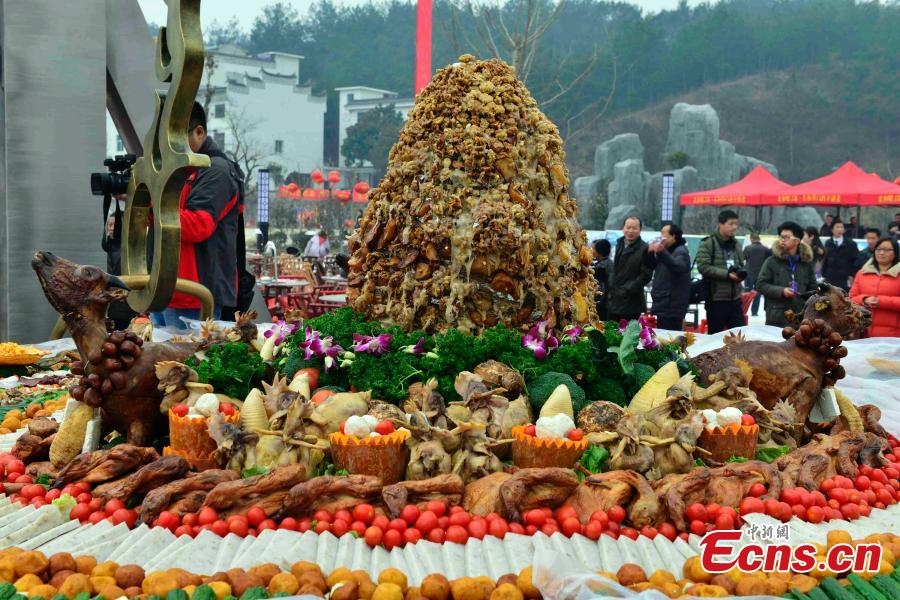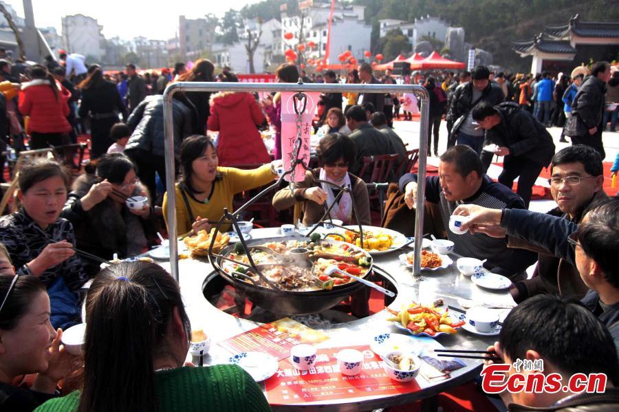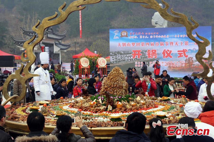 Visitors look at a giant suspended cooking pot during a food festival in a square in Luotian county, Central China’s Hubei province, Jan 24, 2015. The cooper pot, 5 meters in diameter and 3.5 meters high, contains more than 300 types of materials, including chestnuts, chicken, mutton and beef, and weighs 3 tons in total, enough for 100 people to dine together. The county has a tradition of cooking food with suspended pots. [Photo: China News Service/Zhang Chang]