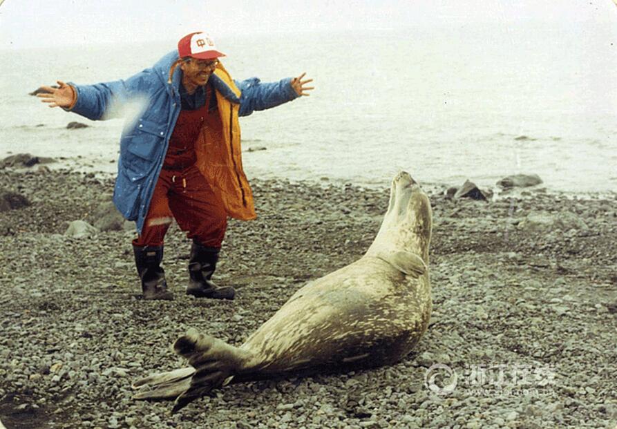 The Second Institute of Oceanography under the State Oceanic Administration sent 18 researchers to launch China’s first Antarctic expedition in 1985. A number of valuable old photos were unveiled as the institute held a seminar on Jan 23 to mark the 30th anniversary of the expedition. The photo shows a researcher plays with a seal on the King George Island. [Photo: zjol.com.cn]