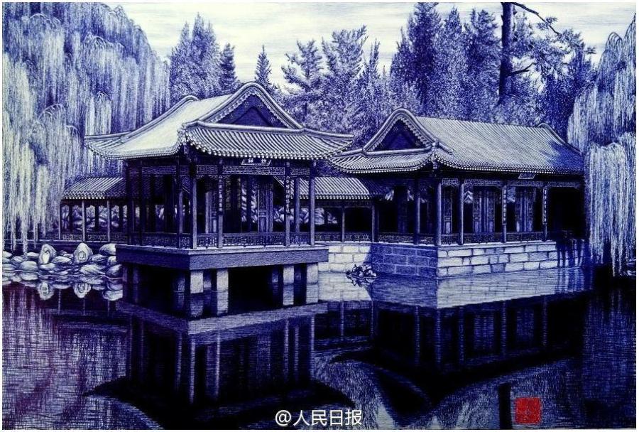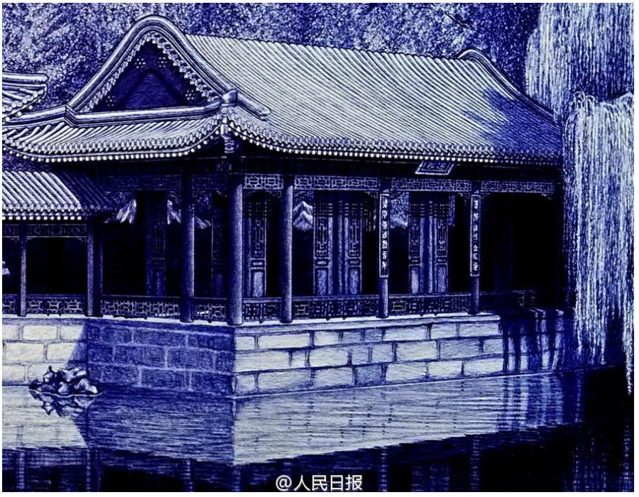 A picture created by a painter with just ballpoint pens. Featuring just two colors of blue and red, those paintings about traditional Chinese buildings caused a sensation on the Internet as netizens were all amazed by the drawing skills of the painter. [Photo/ Weibo account of People's Daily]