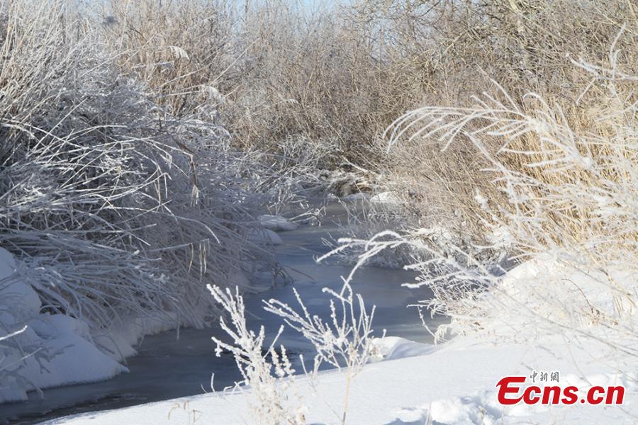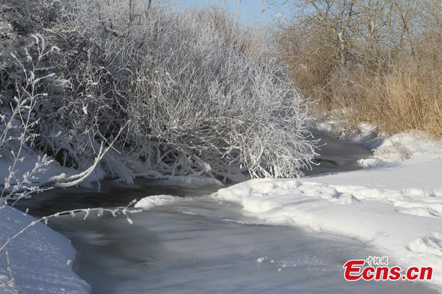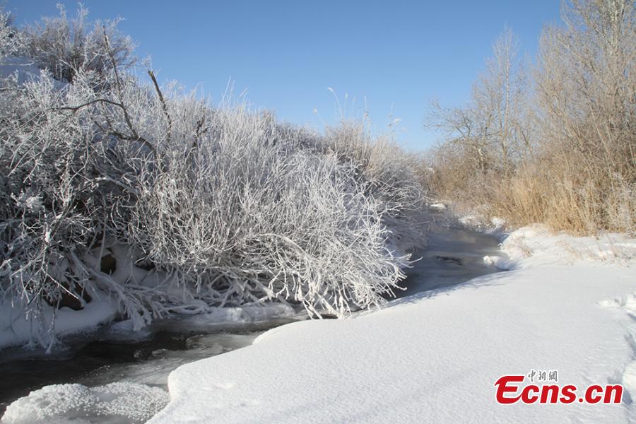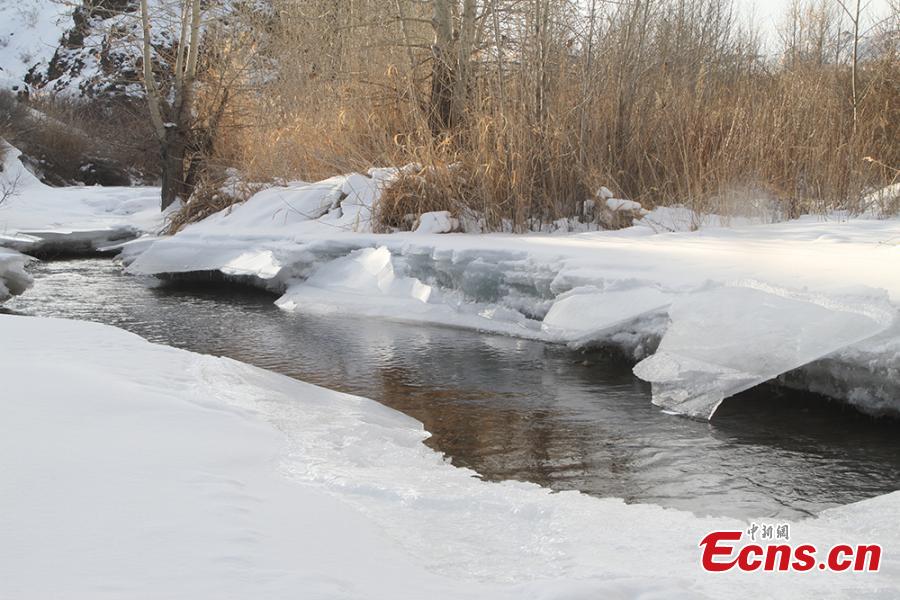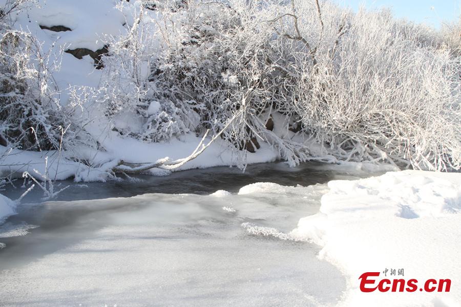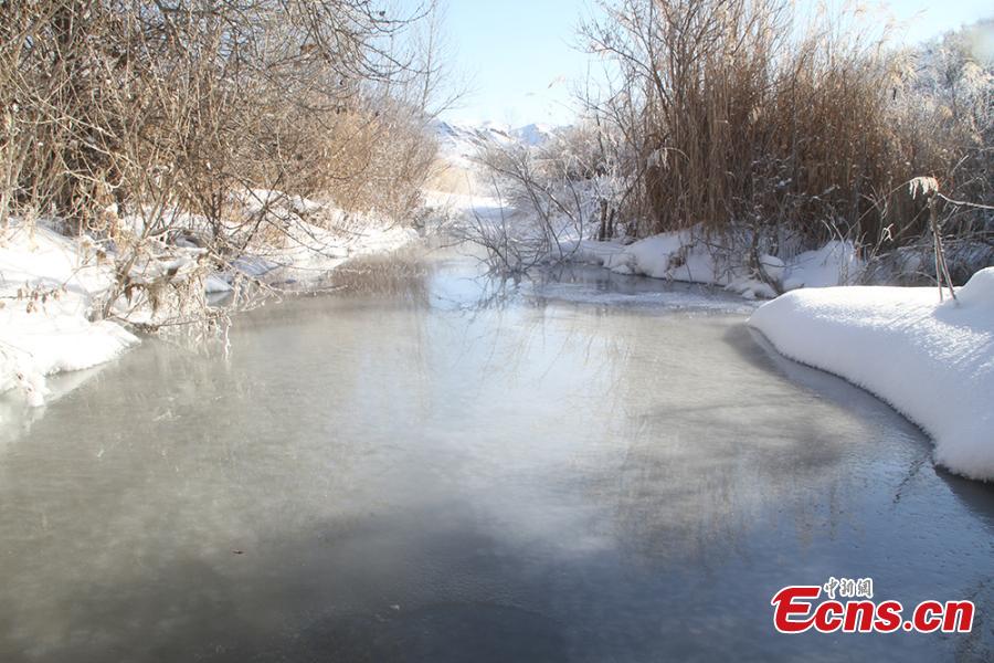 A border river between China and Kazakhstan is covered by ice and snow as temperature drops to minus 30 degrees Centigrade in Northwest China’s Xinjiang Uygur autonomous region. [Photo: China News Service/Hao Shengzhong]