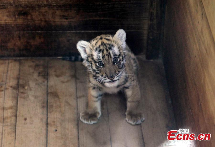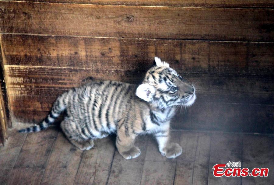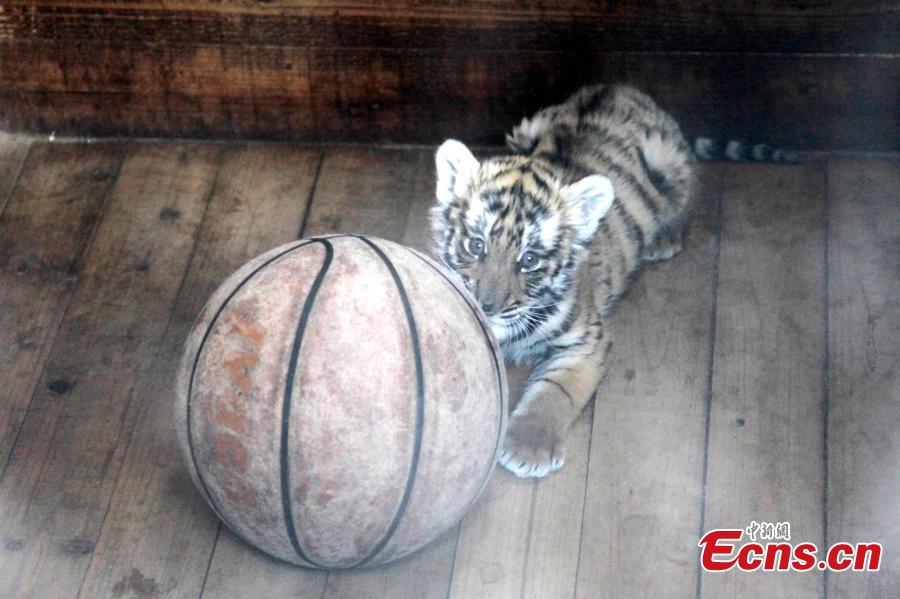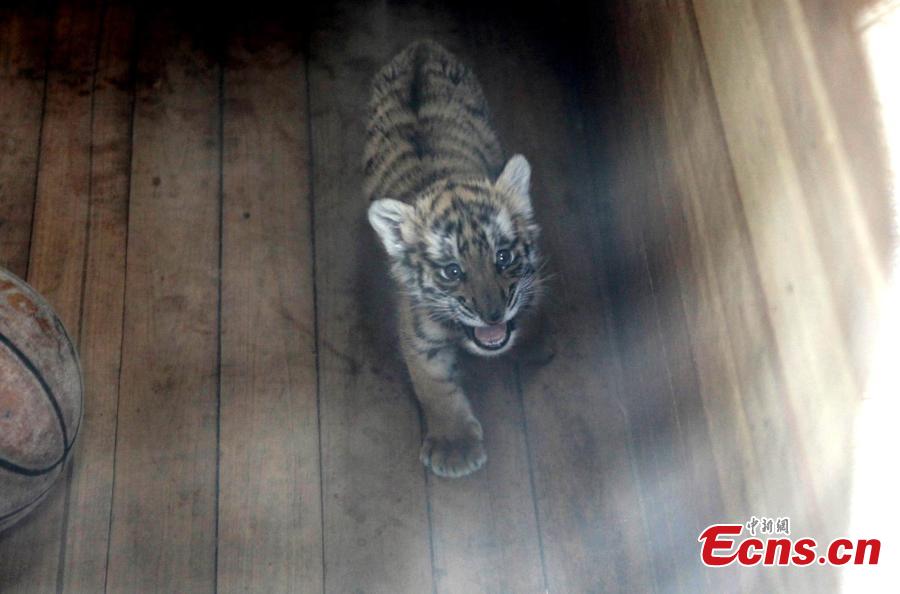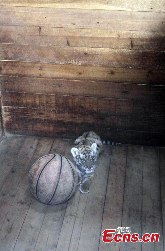 The South China tiger cub that was once tortured by a keeper at a zoo in Nanchang, East China's Jiangxi province plays at the zoo Jan 28, 2015. The tiger cub is recovering well and grows healthily, according to the zoo. In a video shot on January 19, a man is seen grabbing the neck of a cub, which is the size of a kitten, suspending the animal in the air, and punching it in the head when it tries to escape. Kuang Huaming, a manager at the zoo, has confirmed the authenticity of the video and says the keeper involved has been fired. South China tigers, believed to have been extinct in the wild for more than 30 years, are listed as one of the world's ten most endangered animals. [Photo/ Jiang Tao]