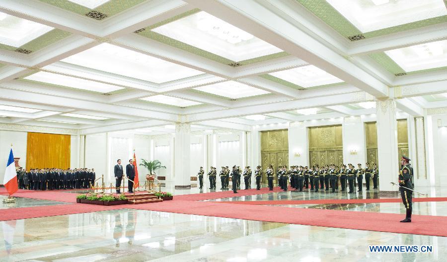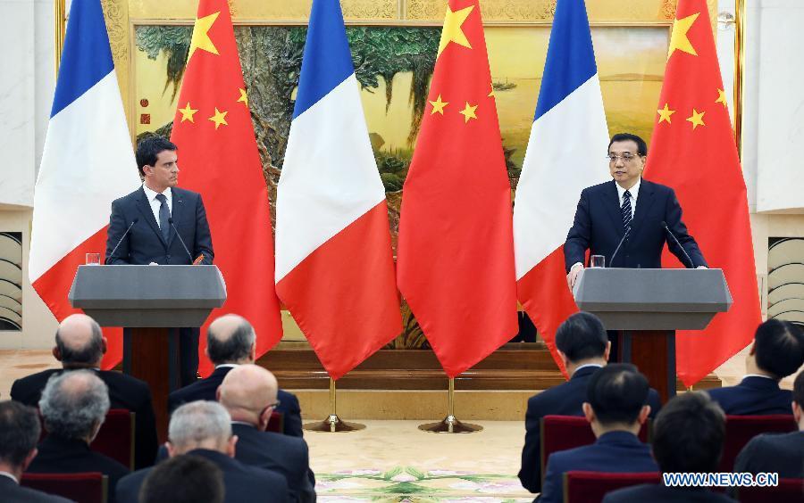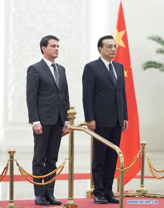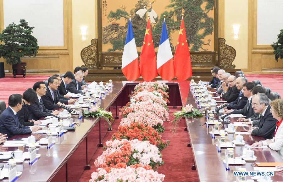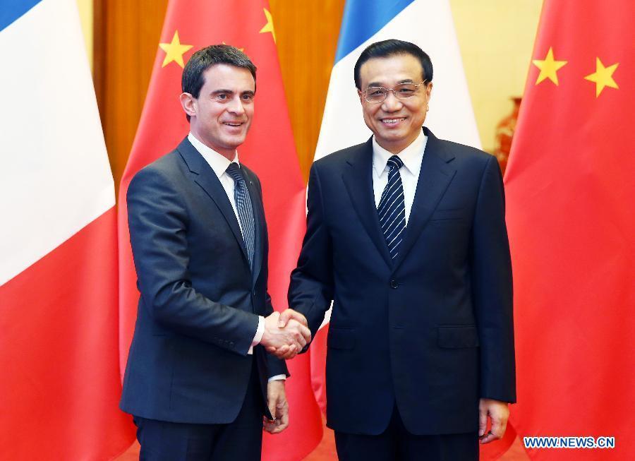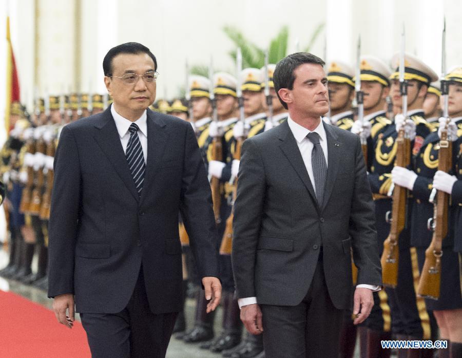 Chinese Premier Li Keqiang (R) holds talks with French Prime Minister Manuel Valls at the Great Hall of the People in Beijing, capital of China, Jan 29, 2015. (Xinhua/Yao Dawei)