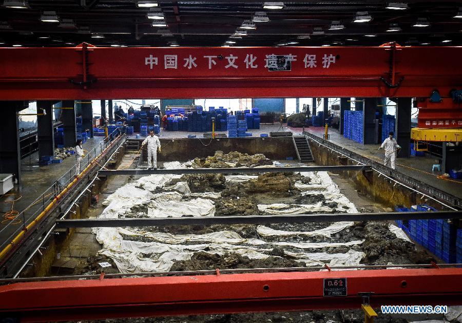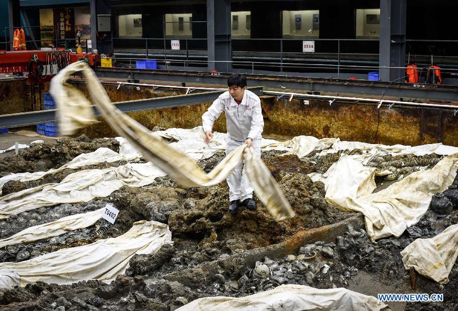 Photo taken on Jan 28, 2015 shows an archaeologist showing ancient coins discovered on the Nanhai (South China Sea) No. 1 ship at the "Crystal Palace" at the Marine Silk Road Museum in Yangjiang, south China's Guangdong province. After seven years of excavation, more than 60,000 porcelain artifacts from the Song Dynasty (960-1279) have been discovered on the ship, which had lain undersea for more than 800 years and was put into protection in the Marine Silk Road Museum after its salvage in 2007. (Xinhua/Liu Dawei)