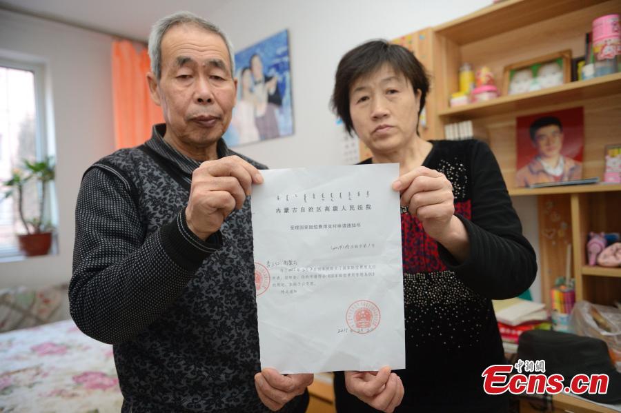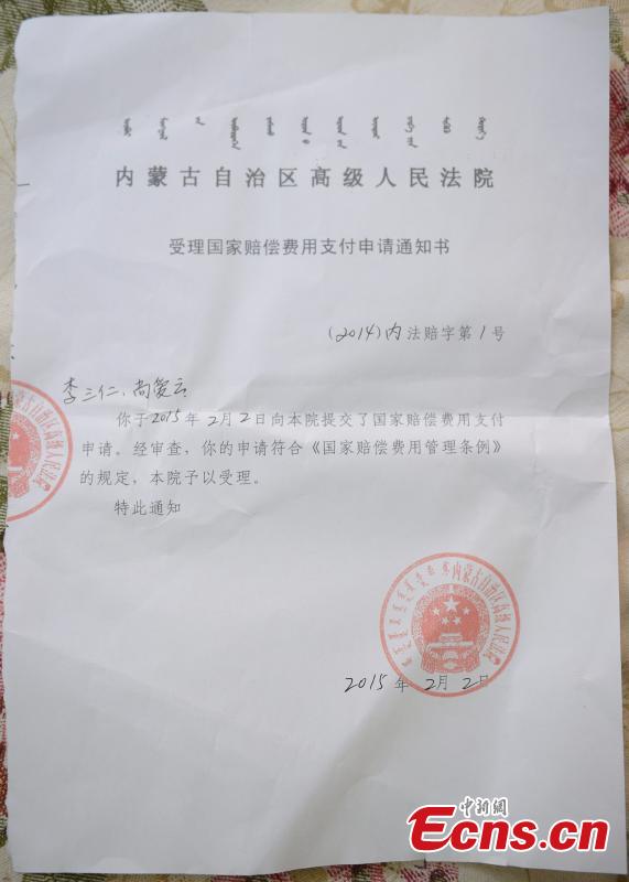 Li Sanren (L) and Shang Aiyun, parents of Huugjilt, who was wrongly executed for rape and murder at age of 18, look at a document that grants the application for state compensation totaling 2,059,621.4 yuan ($332,116) in Hohhot, capital of North China's Inner Mongolia autonomous region, Feb 3, 2015. The parents of Huugjilt received the state compensation on Tuesday, Xinhua New Agency reported. [Photo: China News Service/Liu Wenhua]