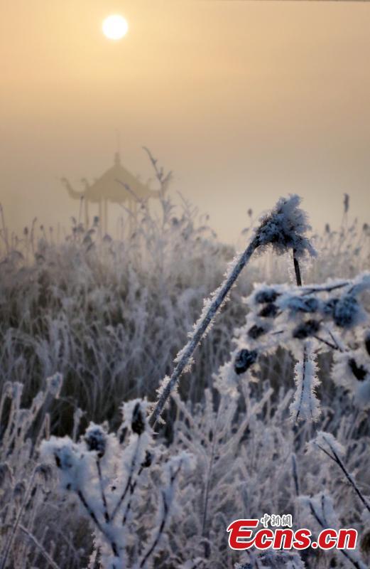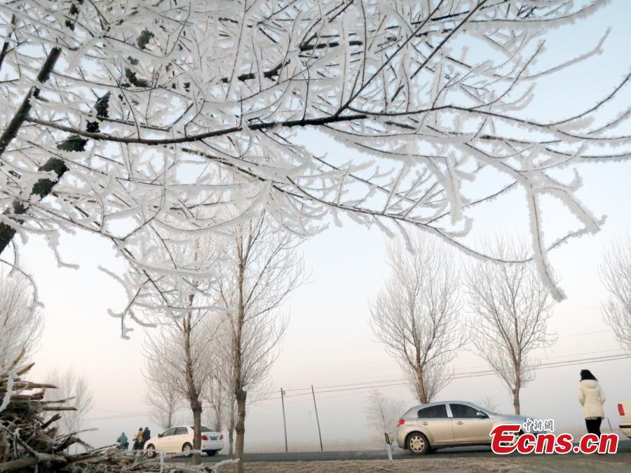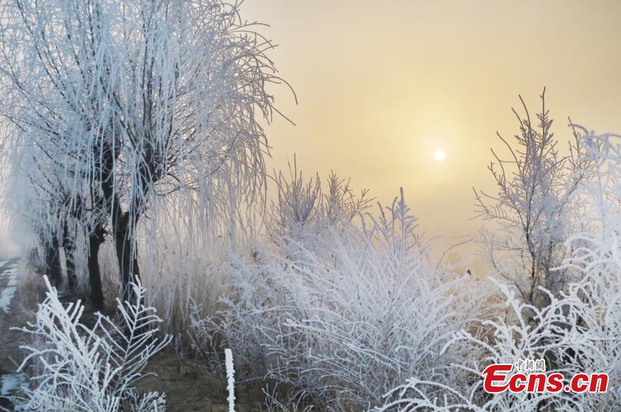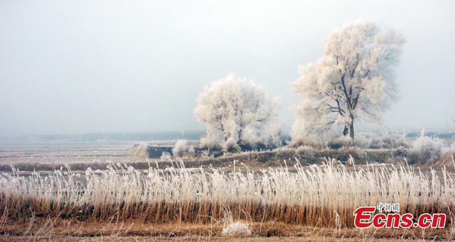 A view of rime-covered trees in Panjin, Northeast China’s Liaoning province, Feb 3, 2015. It is about a six-hour drive from Beijing through the Beijing-Harbin (G1) Expressway to get to Panjin. Meanwhile, a regular train takes about seven hours from Beijing to Panjin, and a high-speed train is three hours. [Photo: China News Service/Li Zhangjian]