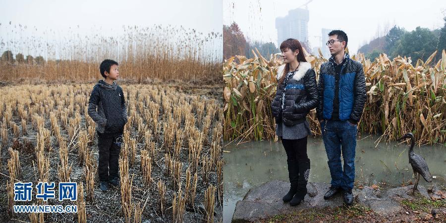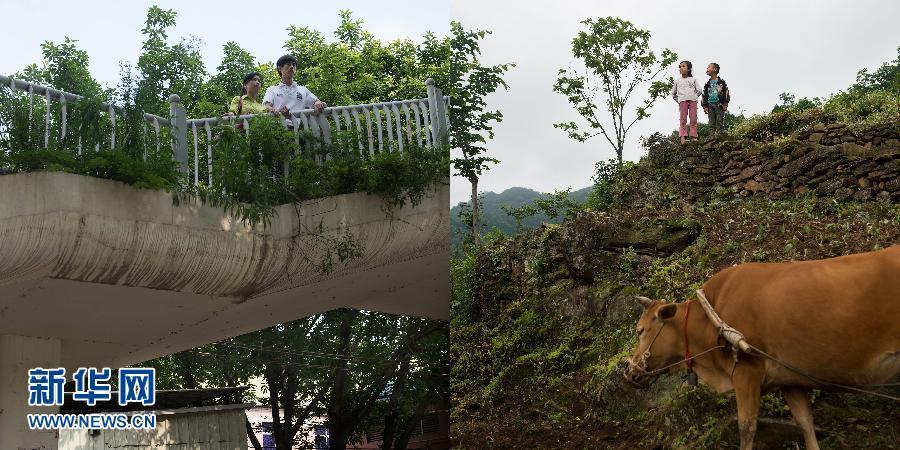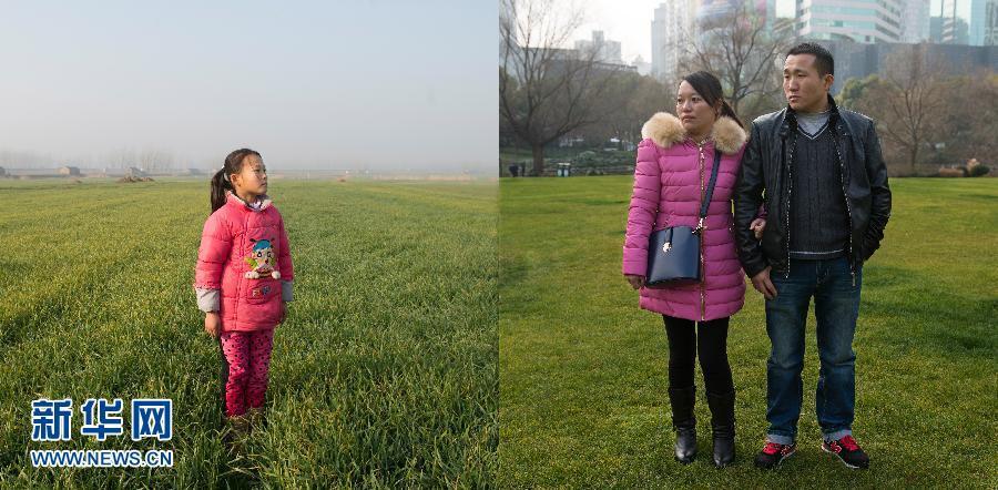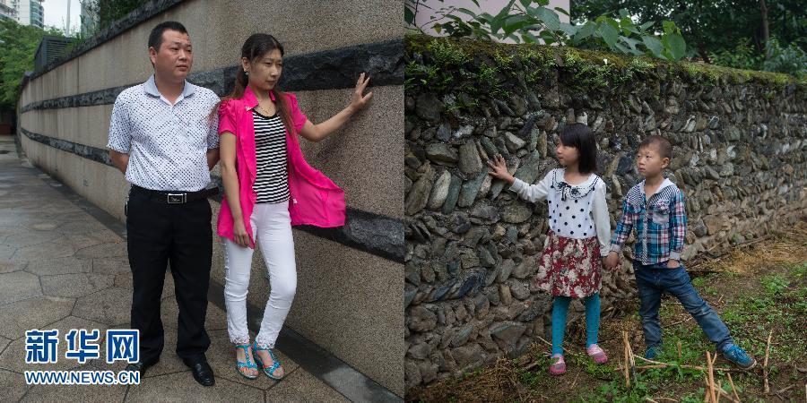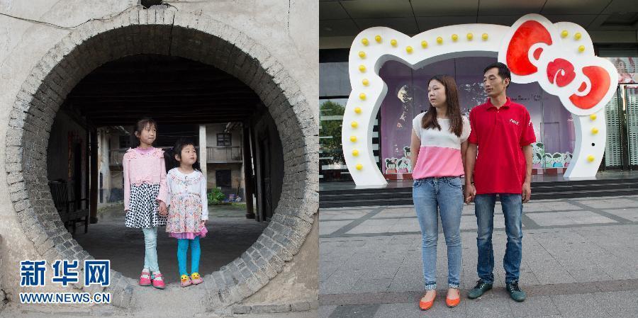 Left -behind children stand in front of an old-style wooden gate in their hometown while their parents in front of an apartment building in a big city. (Xinhua/Liu Jie)